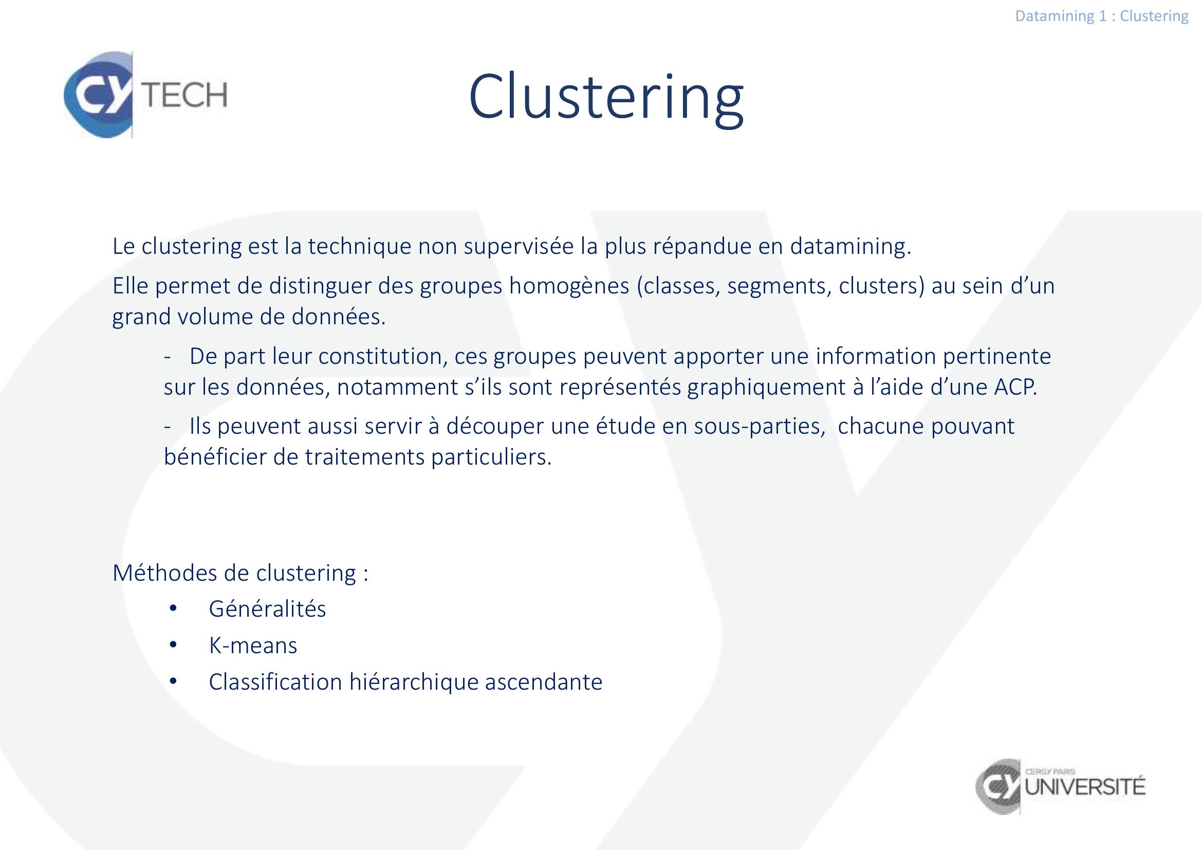 Page 1 : Datamining 1 : ClusteringClusteringMéthodes de clustering :•Généralités•K-means•Classification hiérarchique ascendanteLe clustering est la technique non supervisée la plus répandue en datamining.Elle permet de distinguer des groupes homogènes classes, segments, clusters au sein d’un grand volume de données.- De part leur constitution, ces groupes peuvent apporter une information pertinente sur les données, notamment s’ils sont représentés graphiquement à l’aide d’une ACP.- Ils peuvent aussi servir à découper une étude en sous-parties, chacune pouvant bénéficier de traitements particuliers.