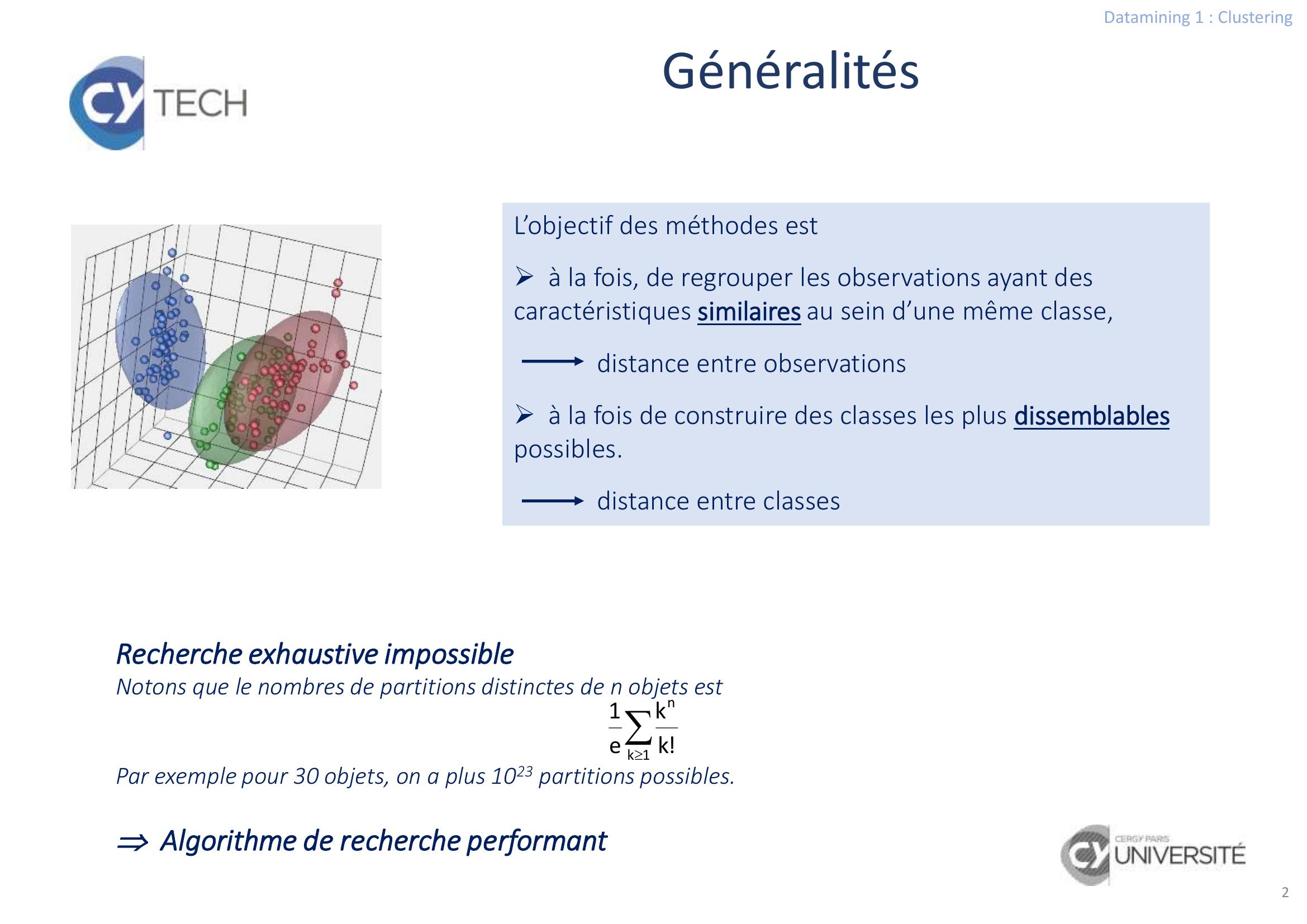 Page 2 : Datamining 1 : ClusteringGénéralités2Recherche exhaustive impossibleNotons que le nombres de partitions distinctes de n objets estPar exemple pour 30 objets, on a plus 1023 partitions possibles.Algorithme de recherche performant1kn!kke1L’objectif des méthodes est à la fois, de regrouper les observations ayant des caractéristiques similaires au sein d’une même classe,distance entre observationsà la fois de construire des classes les plus dissemblablespossibles. distance entre classes