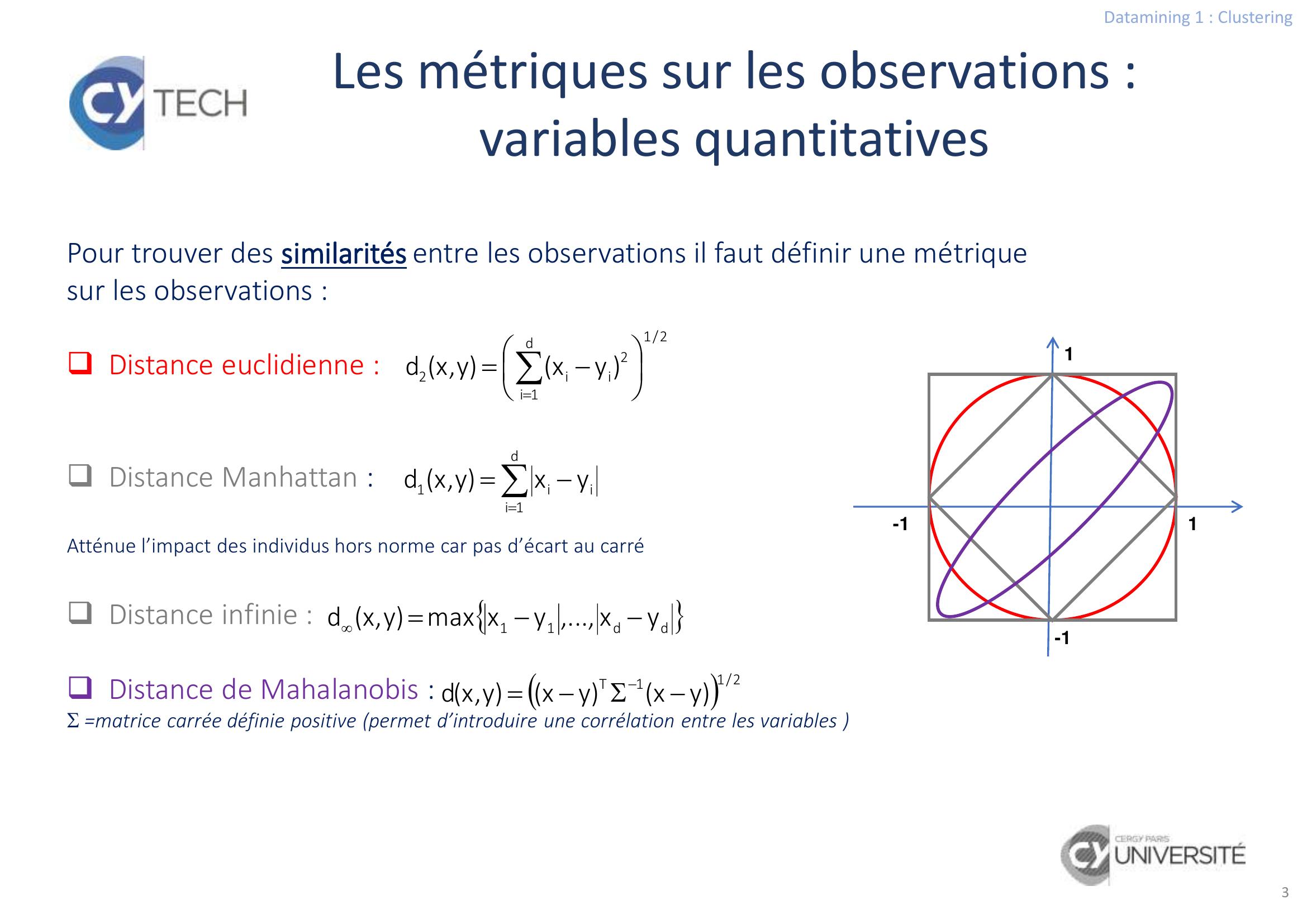 Page 3 : Datamining 1 : Clustering3Les métriques sur les observations : variables quantitatives2/1d1i2ii2yxy,xdd1iii1yxy,xddd11yx,...,yxmaxy,xd2/11Tyxyxy,xdPour trouver des similarités entre les observations il faut définir une métrique sur les observations :Distance euclidienne :Distance Manhattan :Atténue l’impact des individus hors norme car pas d’écart au carréDistance infinie :Distance de Mahalanobis :=matrice carrée définie positive permet d’introduire une corrélation entre les variables -11-11