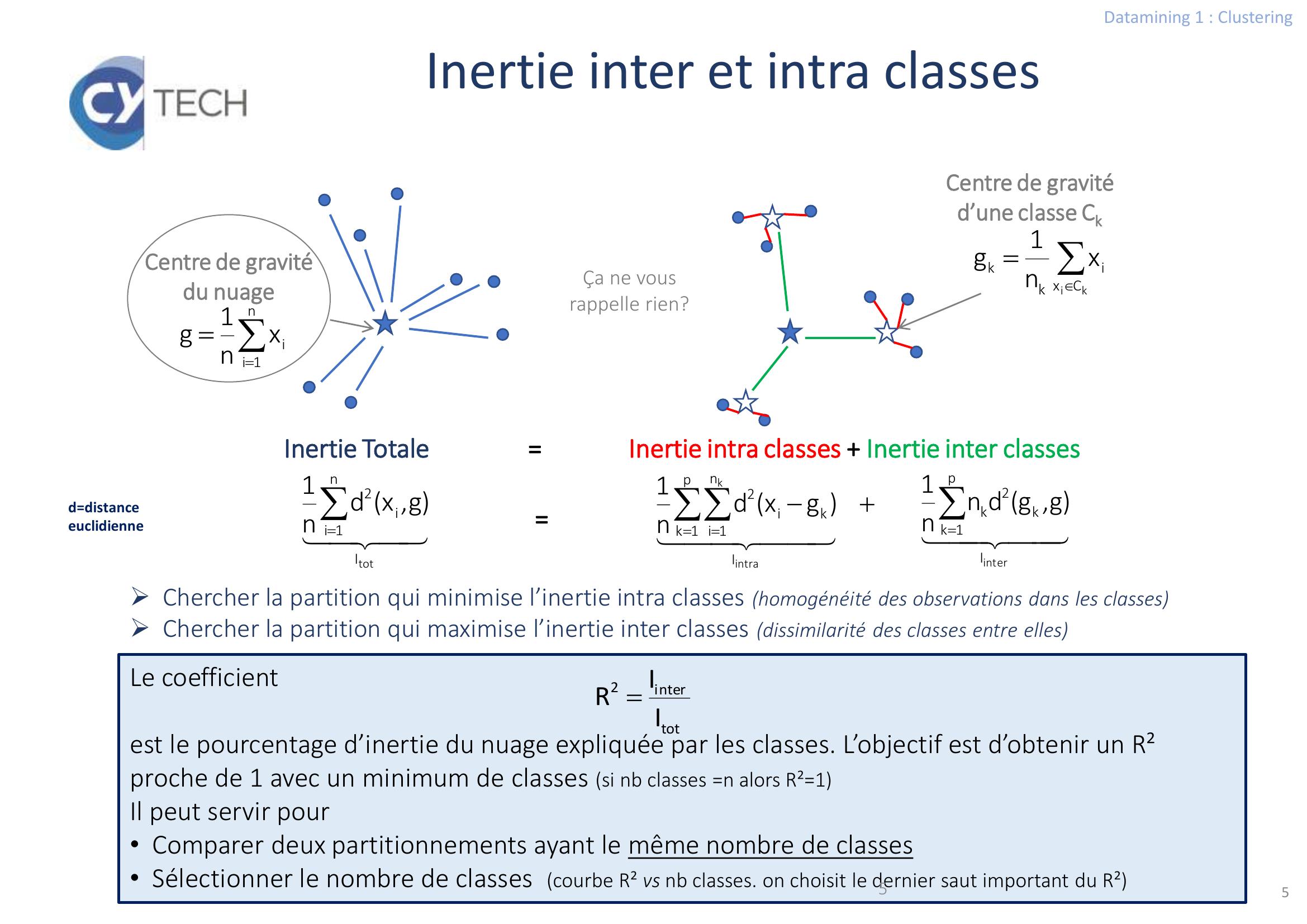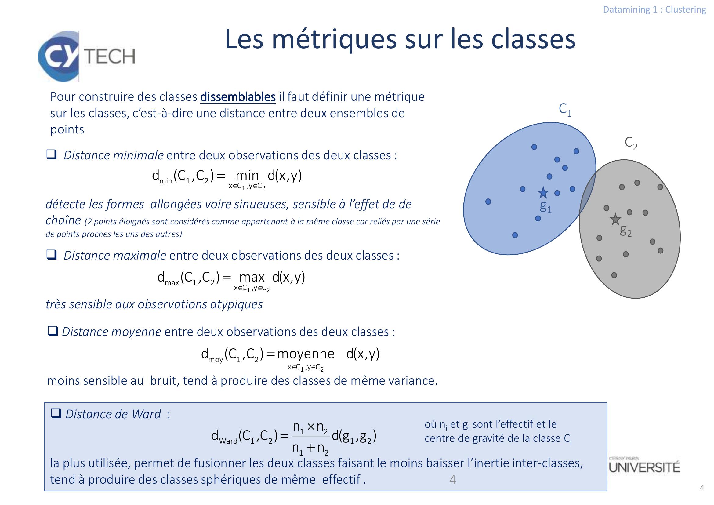 Page 4 : Datamining 1 : Clustering4Les métriques sur les classesDistance de Ward : la plus utilisée, permet de fusionner les deux classes faisant le moins baisser l’inertie inter-classes, tend à produire des classes sphériques de même effectif .4Distance minimale entre deux observations des deux classes : détecte les formes allongées voire sinueuses, sensible à l’effet de de chaîne 2 points éloignés sont considérés comme appartenant à la même classe car reliés par une série de points proches les uns des autresC1C2g1g2y,xdminC,Cd21Cy,Cx21miny,xdmoyenneC,Cd21Cy,Cx21moyg,gdnnnnC,Cd21212121WardDistance moyenne entre deux observations des deux classes : moins sensible au bruit, tend à produire des classes de même variance. Distance maximale entre deux observations des deux classes : très sensible aux observations atypiquesy,xdmaxC,Cd21Cy,Cx21maxPour construire des classes dissemblables il faut définir une métrique sur les classes, c’est-à-dire une distance entre deux ensembles de pointsoù ni et gi sont l’effectif et le centre de gravité de la classe Ci