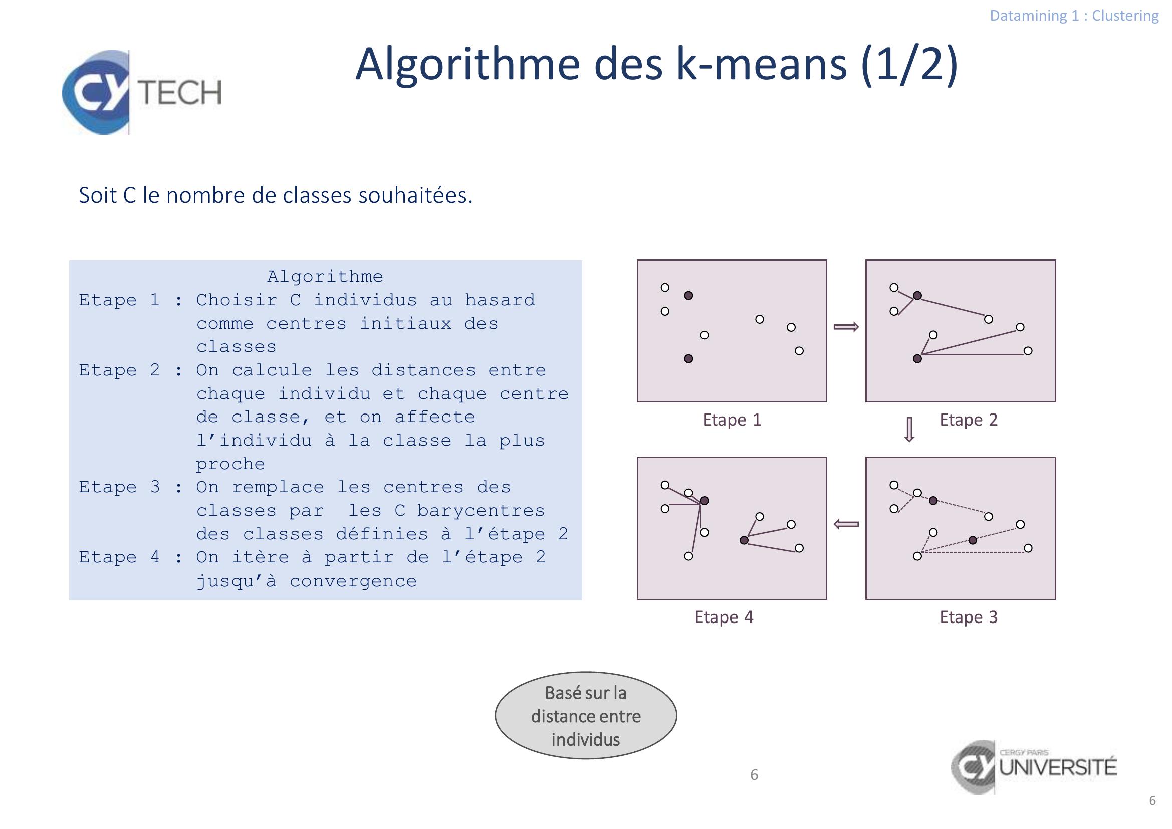 Page 6 : Datamining 1 : Clustering6Algorithme des k-means 1/26AlgorithmeEtape 1 : Choisir C individus au hasard comme centres initiaux des classesEtape 2 : On calcule les distances entre chaque individu et chaque centre de classe, et on affecte l’individu à la classe la plus procheEtape 3 : On remplace les centres des classes par les C barycentres des classes définies à l’étape 2Etape 4 : On itère à partir de l’étape 2 jusqu’à convergenceEtape 1Etape 2Etape 3Etape 4Basé sur la distance entre individusSoit C le nombre de classes souhaitées.