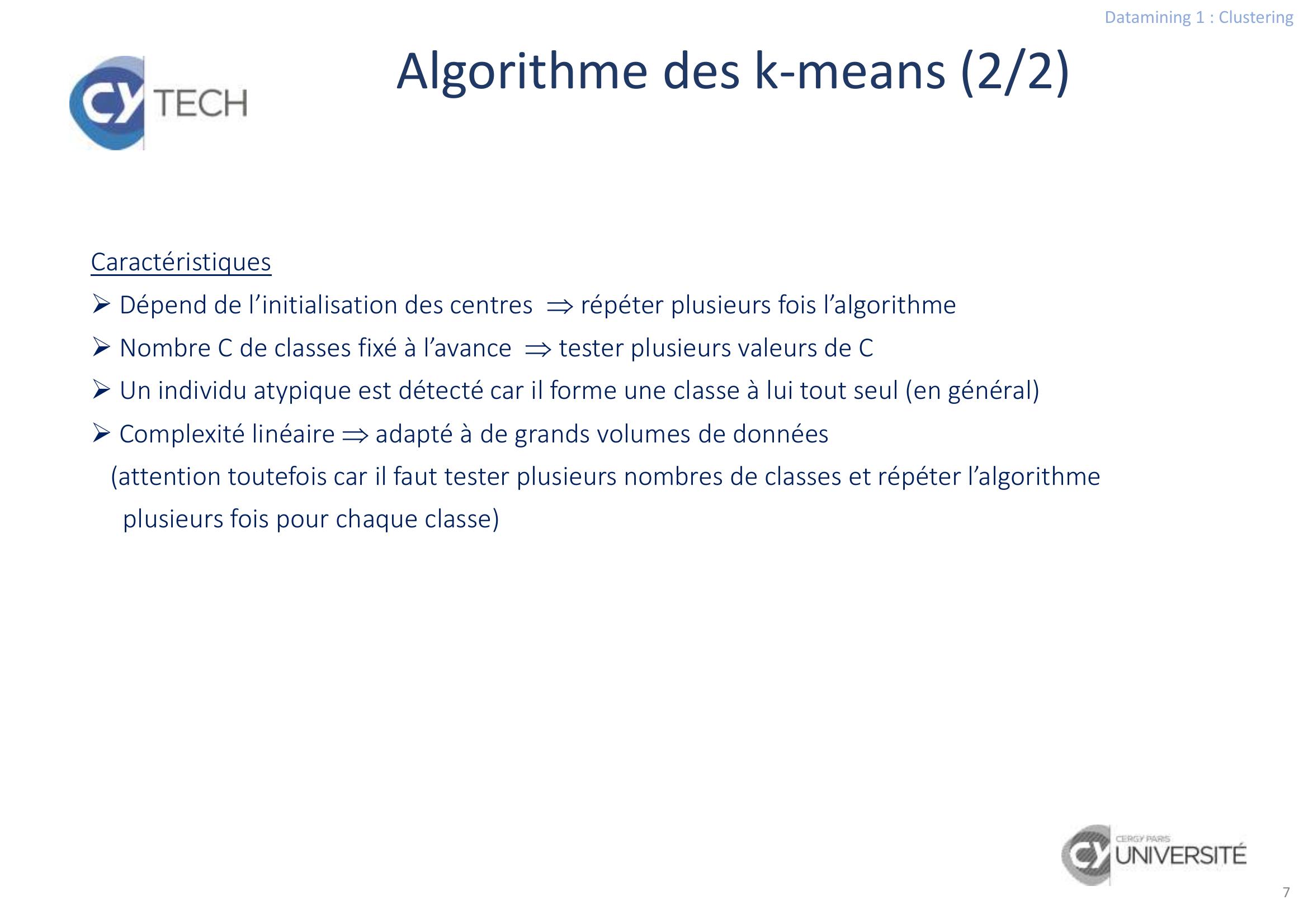 Page 7 : Datamining 1 : Clustering7CaractéristiquesDépend de l’initialisation des centres répéter plusieurs fois l’algorithmeNombre C de classes fixé à l’avance tester plusieurs valeurs de C Un individu atypique est détecté car il forme une classe à lui tout seul en généralComplexité linéaire adapté à de grands volumes de donnéesattention toutefois car il faut tester plusieurs nombres de classes et répéter l’algorithme plusieurs fois pour chaque classeAlgorithme des k-means 2/2