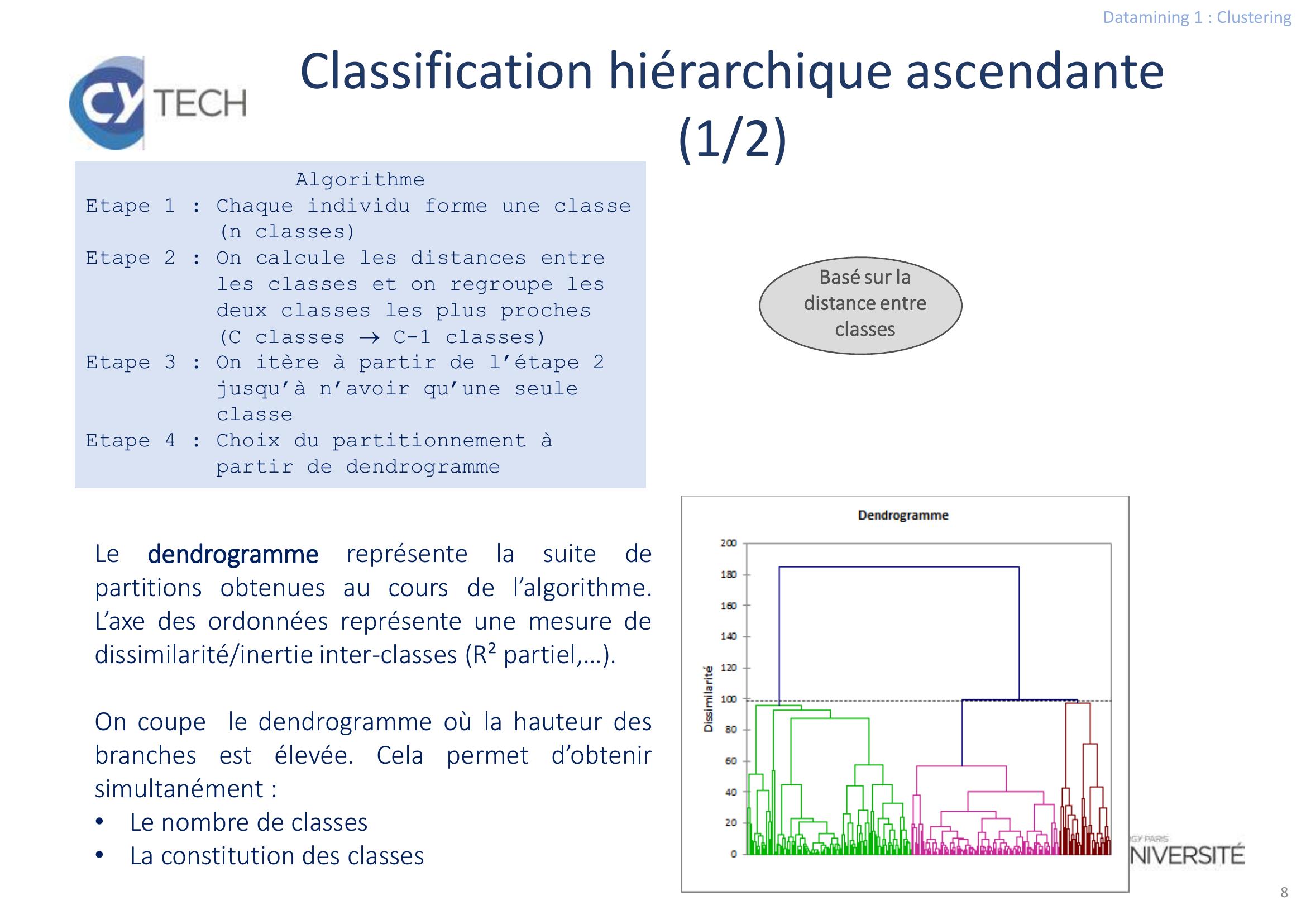 Page 8 : Datamining 1 : Clustering8Classification hiérarchique ascendante1/28AlgorithmeEtape 1 : Chaque individu forme une classe n classesEtape 2 : On calcule les distances entre les classes et on regroupe les deux classes les plus prochesC classes C-1 classesEtape 3 : On itère à partir de l’étape 2 jusqu’à n’avoir qu’une seule classeEtape 4 : Choix du partitionnement à partir de dendrogrammeLedendrogrammereprésentelasuitedepartitions obtenues au cours de l’algorithme.L’axe des ordonnées représente une mesure dedissimilarité/inertie inter-classes R² partiel,….On coupe le dendrogramme où la hauteur desbranches est élevée. Cela permet d’obtenirsimultanément :•Le nombre de classes•La constitution des classesBasé sur la distance entre classes