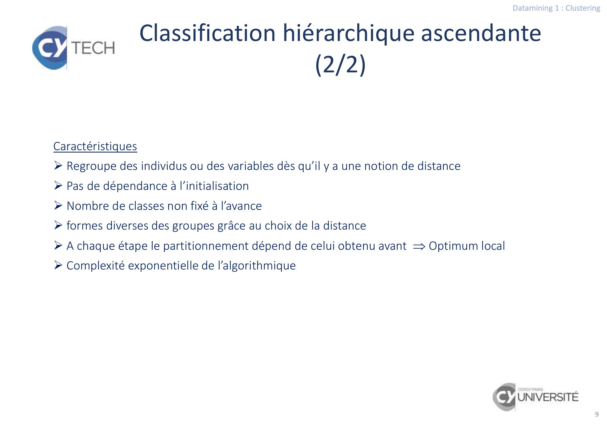 Page 9 : Datamining 1 : Clustering9Classification hiérarchique ascendante2/2Caractéristiques Regroupe des individus ou des variables dès qu’il y a une notion de distancePas de dépendance à l’initialisationNombre de classes non fixé à l’avanceformes diverses des groupes grâce au choix de la distance A chaque étape le partitionnement dépend de celui obtenu avant Optimum localComplexité exponentielle de l’algorithmique