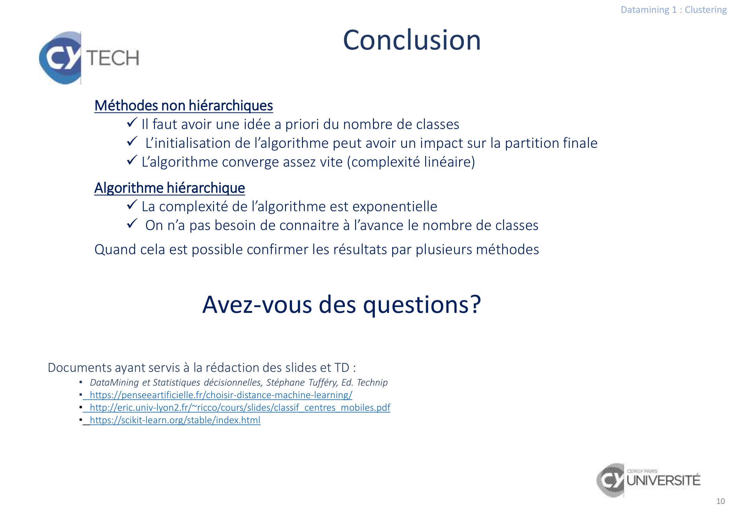 Page 10 : Datamining 1 : Clustering10Avez-vous des questions?Documents ayant servis à la rédaction des slides et TD :• DataMining et Statistiques décisionnelles, Stéphane Tufféry, Ed. Technip• https://penseeartificielle.fr/choisir-distance-machine-learning/• http://eric.univ-lyon2.fr/ricco/cours/slides/classifcentresmobiles.pdf• https://scikit-learn.org/stable/index.htmlMéthodes non hiérarchiquesIl faut avoir une idée a priori du nombre de classes L’initialisation de l’algorithme peut avoir un impact sur la partition finaleL’algorithme converge assez vite complexité linéaireAlgorithme hiérarchique La complexité de l’algorithme est exponentielleOn n’a pas besoin de connaitre à l’avance le nombre de classesQuand cela est possible confirmer les résultats par plusieurs méthodesConclusion
