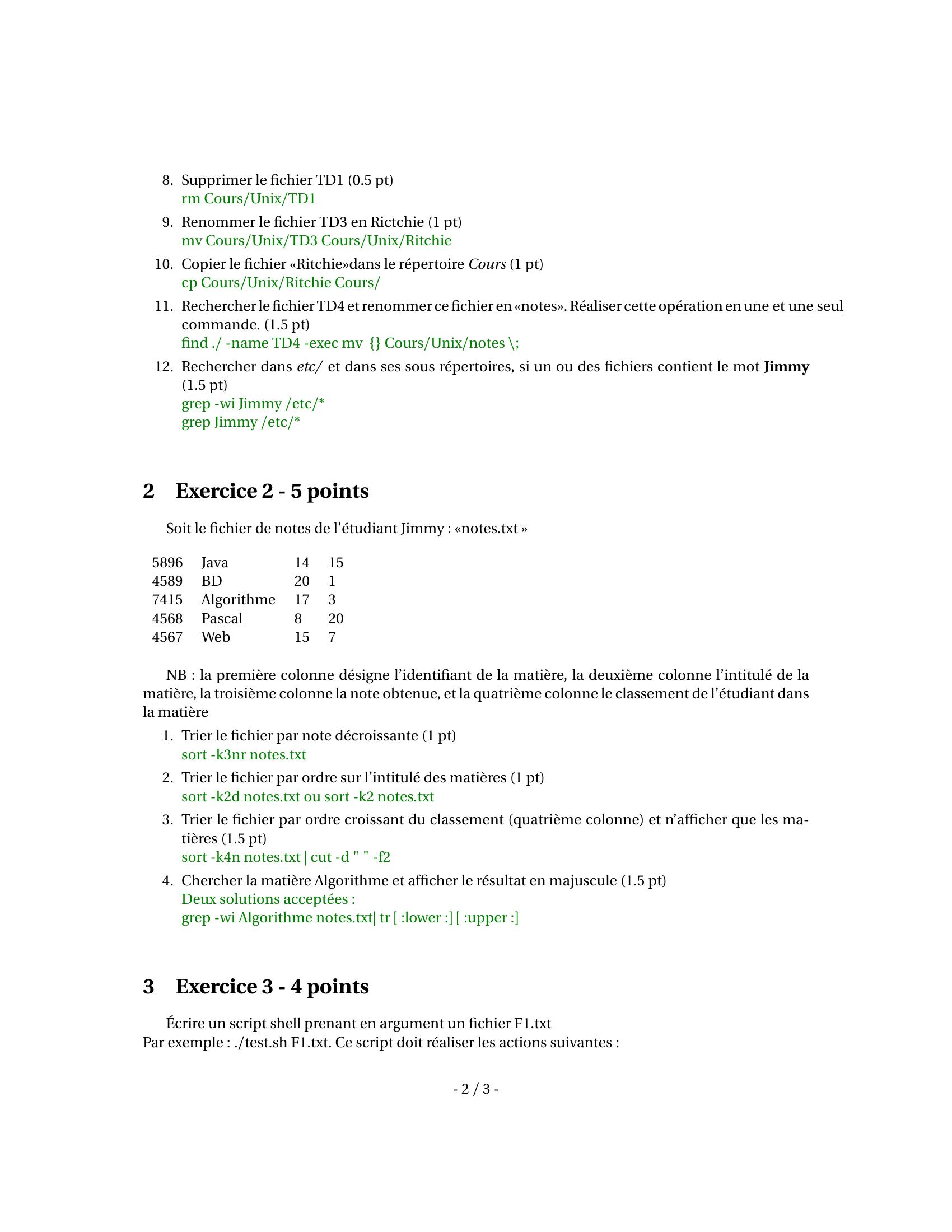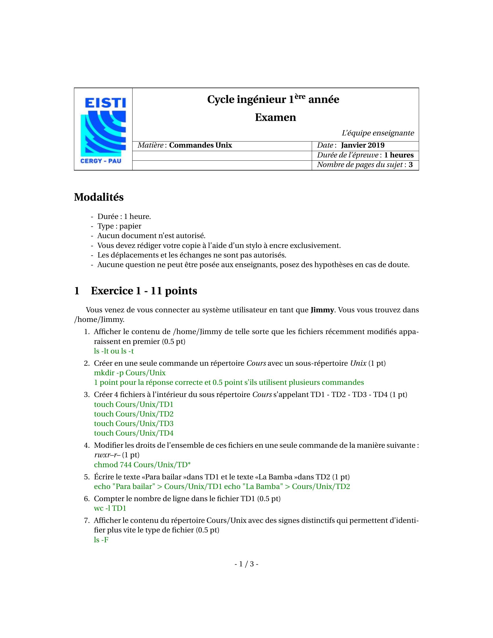 Page 1 : Cycle ingénieur 1ère annéeExamenL’équipe enseignanteMatière : Commandes UnixDate : Janvier 2019Durée de l’épreuve : 1 heuresNombre de pages du sujet : 3Modalités- Durée : 1 heure.- Type : papier- Aucun document n’est autorisé.- Vous devez rédiger votre copie à l’aide d’un stylo à encre exclusivement.- Les déplacements et les échanges ne sont pas autorisés.- Aucune question ne peut être posée aux enseignants, posez des hypothèses en cas de doute.1Exercice 1 - 11 pointsVous venez de vous connecter au système utilisateur en tant que Jimmy. Vous vous trouvez dans/home/Jimmy.1. Afficher le contenu de /home/Jimmy de telle sorte que les fichiers récemment modifiés appa-raissent en premier 0.5 ptls -lt ou ls -t2. Créer en une seule commande un répertoire Cours avec un sous-répertoire Unix 1 ptmkdir -p Cours/Unix1 point pour la réponse correcte et 0.5 point s’ils utilisent plusieurs commandes3. Créer 4 fichiers à l’intérieur du sous répertoire Cours s’appelant TD1 - TD2 - TD3 - TD4 1 pttouch Cours/Unix/TD1touch Cours/Unix/TD2touch Cours/Unix/TD3touch Cours/Unix/TD44. Modifier les droits de l’ensemble de ces fichiers en une seule commande de la manière suivante :rwxr–r– 1 ptchmod 744 Cours/Unix/TD5. Écrire le texte «Para bailar »dans TD1 et le texte «La Bamba »dans TD2 1 ptecho "Para bailar" Cours/Unix/TD1 echo "La Bamba" Cours/Unix/TD26. Compter le nombre de ligne dans le fichier TD1 0.5 ptwc -l TD17. Afficher le contenu du répertoire Cours/Unix avec des signes distinctifs qui permettent d’identi-fier plus vite le type de fichier 0.5 ptls -F- 1 / 3 -