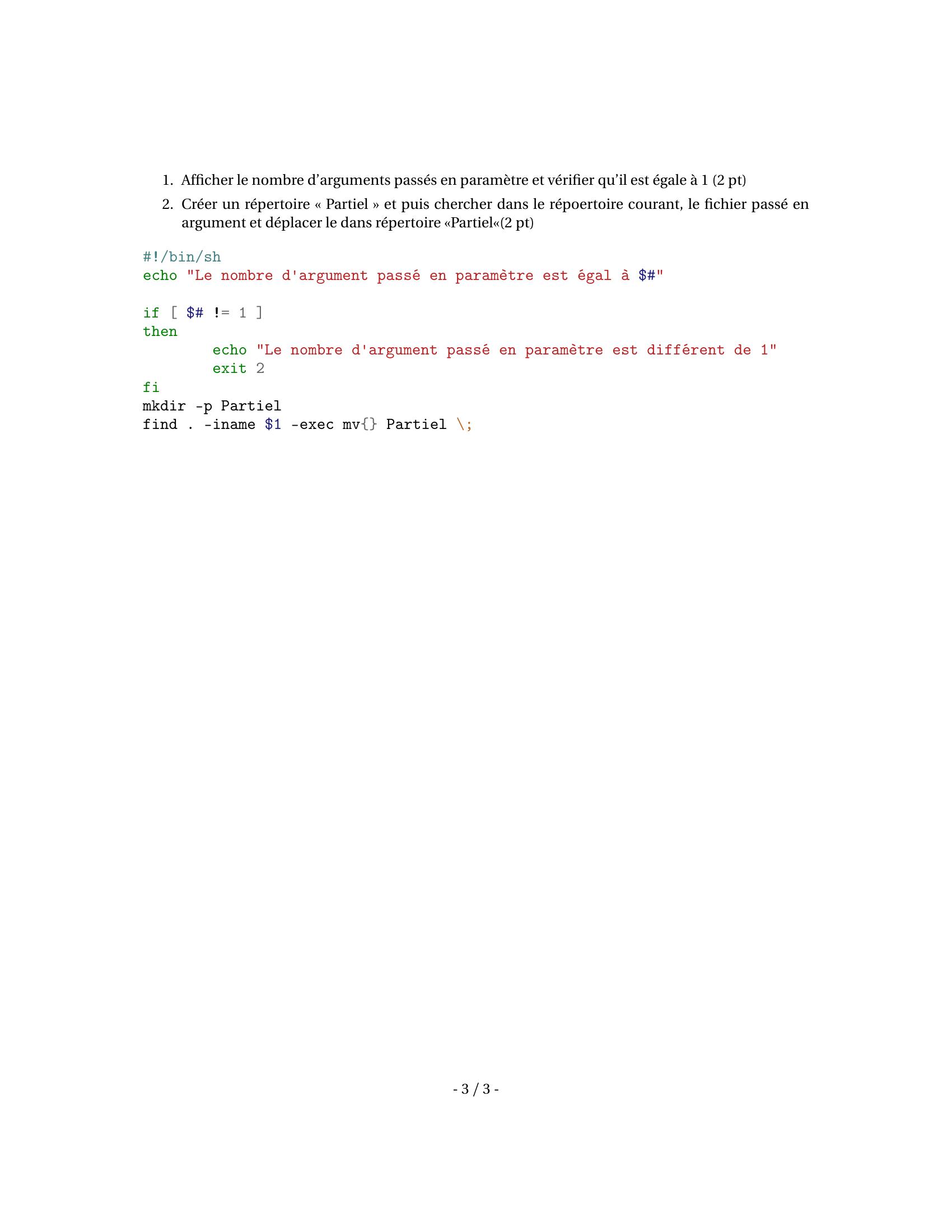 Page 3 : 1. Afficher le nombre d’arguments passés en paramètre et vérifier qu’il est égale à 1 2 pt2. Créer un répertoire « Partiel » et puis chercher dans le répoertoire courant, le fichier passé enargument et déplacer le dans répertoire «Partiel«2 pt!/bin/shecho "Le nombre d'argument passé en paramètre est égal à "if != 1 thenecho "Le nombre d'argument passé en paramètre est différent de 1"exit 2fimkdir -p Partielfind . -iname 1 -exec mv Partiel \;- 3 / 3 -