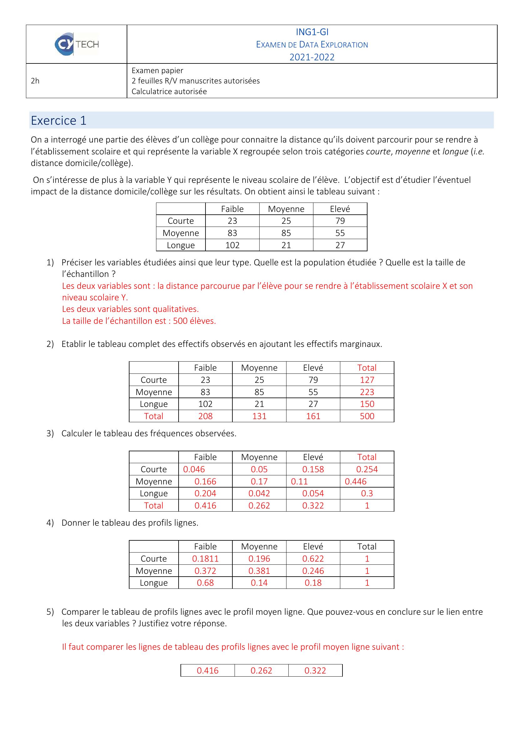 Page 1 : ING1-GI EXAMEN DE DATA EXPLORATION 2021-2022 2h Examen papier 2 feuilles R/V manuscrites autorisées Calculatrice autorisée Exercice 1 On a interrogé une partie des élèves d’un collège pour connaitre la distance qu’ils doivent parcourir pour se rendre à l’établissement scolaire et qui représente la variable X regroupée selon trois catégories courte, moyenne et longue i.e. distance domicile/collège. On s’intéresse de plus à la variable Y qui représente le niveau scolaire de l’élève. L’objectif est d’étudier l’éventuel impact de la distance domicile/collège sur les résultats. On obtient ainsi le tableau suivant : FaibleMoyenneElevéCourte232579Moyenne838555Longue10221271 Préciser les variables étudiées ainsi que leur type. Quelle est la population étudiée ? Quelle est la taille de l’échantillon ? Les deux variables sont : la distance parcourue par l’élève pour se rendre à l’établissement scolaire X et son niveau scolaire Y. Les deux variables sont qualitatives. La taille de l’échantillon est : 500 élèves. 2 Etablir le tableau complet des effectifs observés en ajoutant les effectifs marginaux. FaibleMoyenneElevéTotalCourte232579127Moyenne838555223Longue1022127150Total2081311615003 Calculer le tableau des fréquences observées. FaibleMoyenneElevéTotalCourte0.0460.050.1580.254Moyenne0.1660.170.110.446Longue0.2040.0420.0540.3Total0.4160.2620.32214 Donner le tableau des profils lignes. FaibleMoyenneElevéTotalCourte0.18110.1960.6221Moyenne0.3720.3810.2461Longue0.680.140.181 5 Comparer le tableau de profils lignes avec le profil moyen ligne. Que pouvez-vous en conclure sur le lien entre les deux variables ? Justifiez votre réponse. Il faut comparer les lignes de tableau des profils lignes avec le profil moyen ligne suivant : 0.4160.2620.322