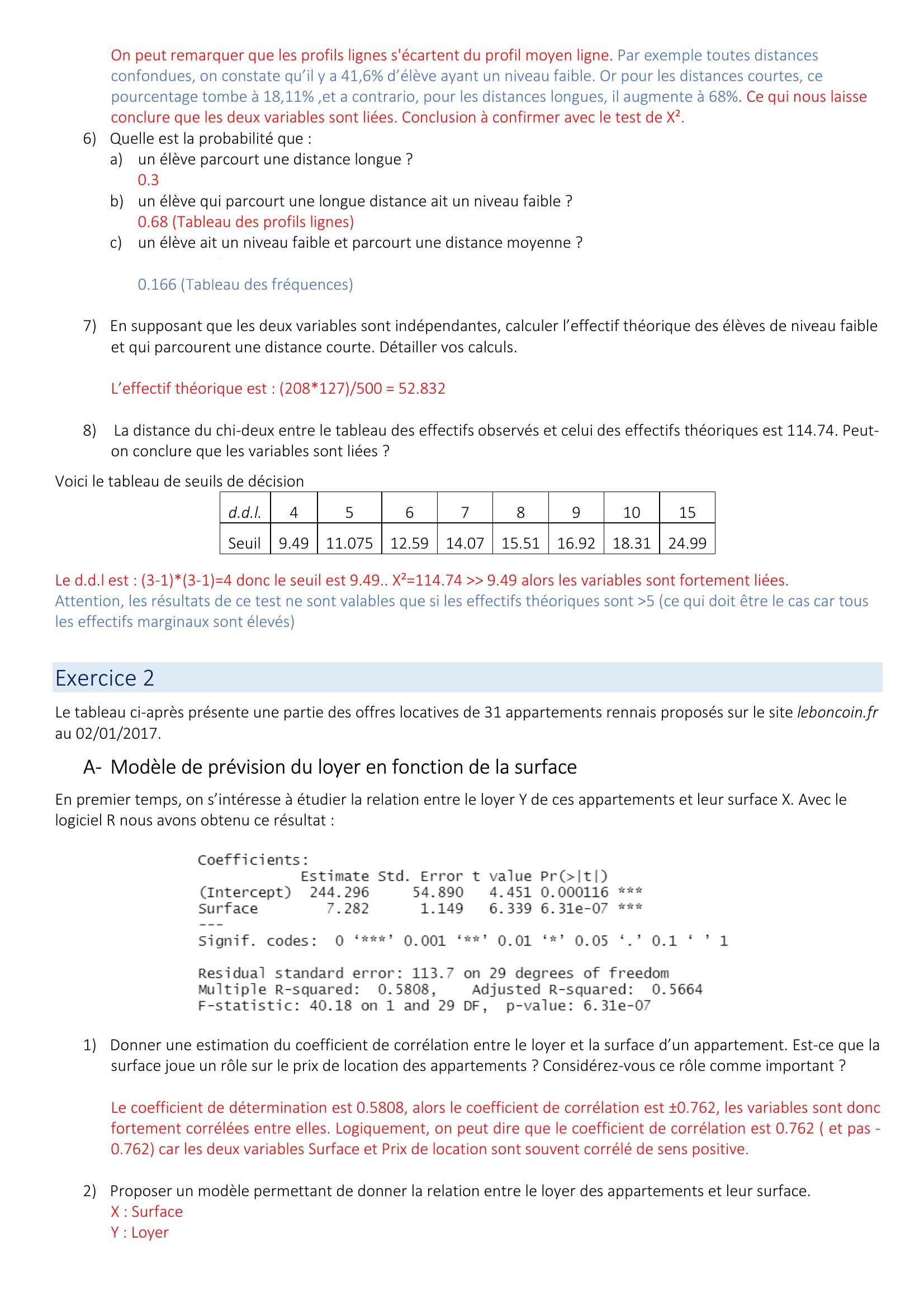 Page 2 : On peut remarquer que les profils lignes s'écartent du profil moyen ligne. Par exemple toutes distances confondues, on constate qu’il y a 41,6 d’élève ayant un niveau faible. Or pour les distances courtes, ce pourcentage tombe à 18,11 ,et a contrario, pour les distances longues, il augmente à 68. Ce qui nous laisse conclure que les deux variables sont liées. Conclusion à confirmer avec le test de X². 6 Quelle est la probabilité que : a un élève parcourt une distance longue ? 0.3 b un élève qui parcourt une longue distance ait un niveau faible ? 0.68 Tableau des profils lignes c un élève ait un niveau faible et parcourt une distance moyenne ? 83/208 = 0.39 0.166 Tableau des fréquences 7 En supposant que les deux variables sont indépendantes, calculer l’effectif théorique des élèves de niveau faible et qui parcourent une distance courte. Détailler vos calculs. L’effectif théorique est : 208127/500 = 52.832 8 La distance du chi-deux entre le tableau des effectifs observés et celui des effectifs théoriques est 114.74. Peut-on conclure que les variables sont liées ? Voici le tableau de seuils de décision d.d.l.4 5 6 7 8 9 10 15 Seuil 9.4911.07512.5914.0715.5116.9218.3124.99 Le d.d.l est : 3-13-1=4 donc le seuil est 9.49.. X²=114.74 9.49 alors les variables sont fortement liées. Attention, les résultats de ce test ne sont valables que si les effectifs théoriques sont 5 ce qui doit être le cas car tous les effectifs marginaux sont élevés Exercice 2 Le tableau ci-après présente une partie des offres locatives de 31 appartements rennais proposés sur le site leboncoin.fr au 02/01/2017. A- Modèle de prévision du loyer en fonction de la surface En premier temps, on s’intéresse à étudier la relation entre le loyer Y de ces appartements et leur surface X. Avec le logiciel R nous avons obtenu ce résultat : 1 Donner une estimation du coefficient de corrélation entre le loyer et la surface d’un appartement. Est-ce que la surface joue un rôle sur le prix de location des appartements ? Considérez-vous ce rôle comme important ? Le coefficient de détermination est 0.5808, alors le coefficient de corrélation est ±0.762, les variables sont donc fortement corrélées entre elles. Logiquement, on peut dire que le coefficient de corrélation est 0.762 et pas -0.762 car les deux variables Surface et Prix de location sont souvent corrélé de sens positive. 2 Proposer un modèle permettant de donner la relation entre le loyer des appartements et leur surface. X : Surface Y : Loyer