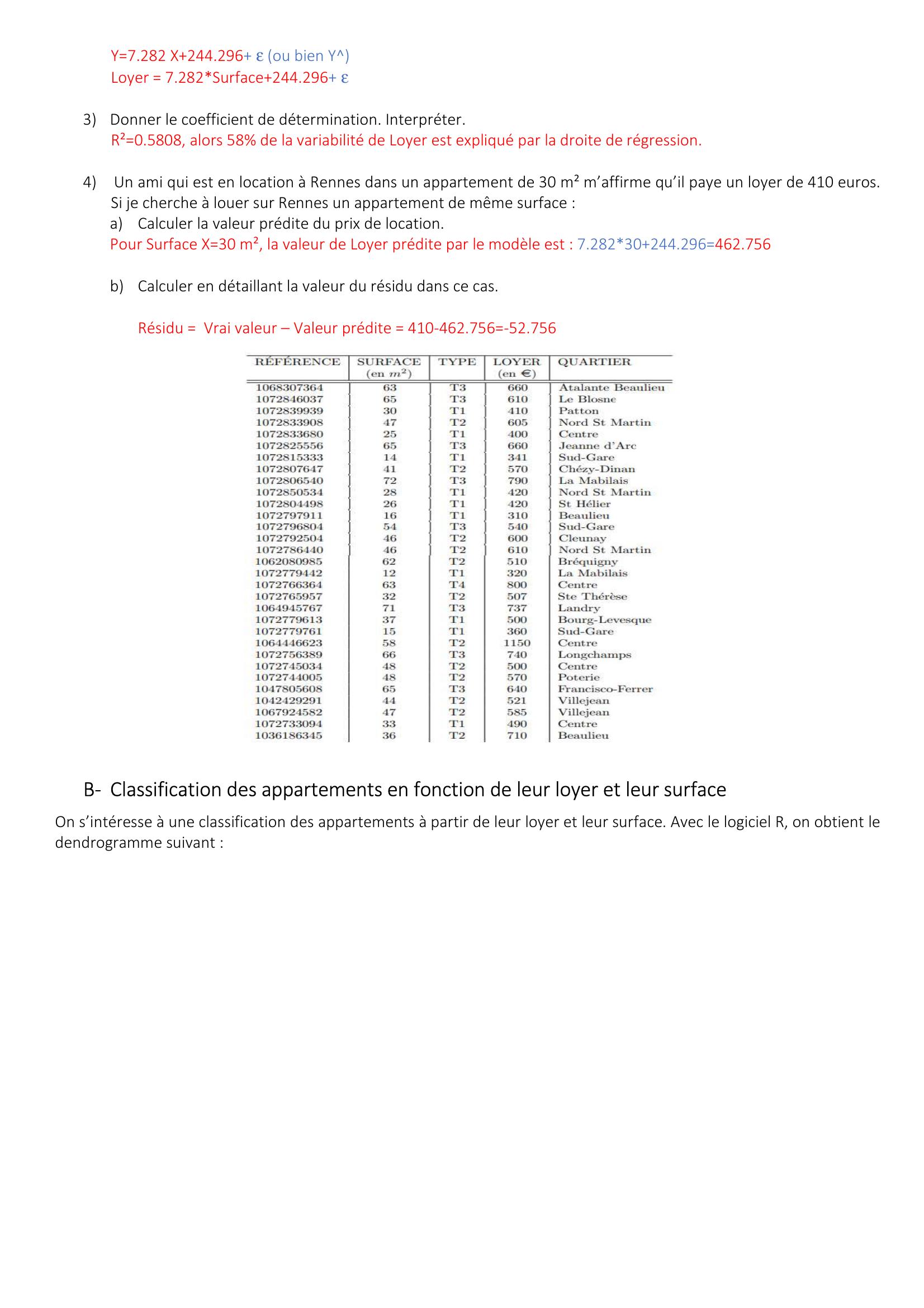 Page 3 : Y=7.282 X+244.296+ ε ou bien Y^ Loyer = 7.282Surface+244.296+ ε 3 Donner le coefficient de détermination. Interpréter. R²=0.5808, alors 58 de la variabilité de Loyer est expliqué par la droite de régression. 4 Un ami qui est en location à Rennes dans un appartement de 30 m² m’affirme qu’il paye un loyer de 410 euros. Si je cherche à louer sur Rennes un appartement de même surface : a Calculer la valeur prédite du prix de location. Pour Surface X=30 m², la valeur de Loyer prédite par le modèle est : 7.28230+244.296=462.756 b Calculer en détaillant la valeur du résidu dans ce cas. Résidu = Vrai valeur – Valeur prédite = 410-462.756=-52.756 B- Classification des appartements en fonction de leur loyer et leur surface On s’intéresse à une classification des appartements à partir de leur loyer et leur surface. Avec le logiciel R, on obtient le dendrogramme suivant :