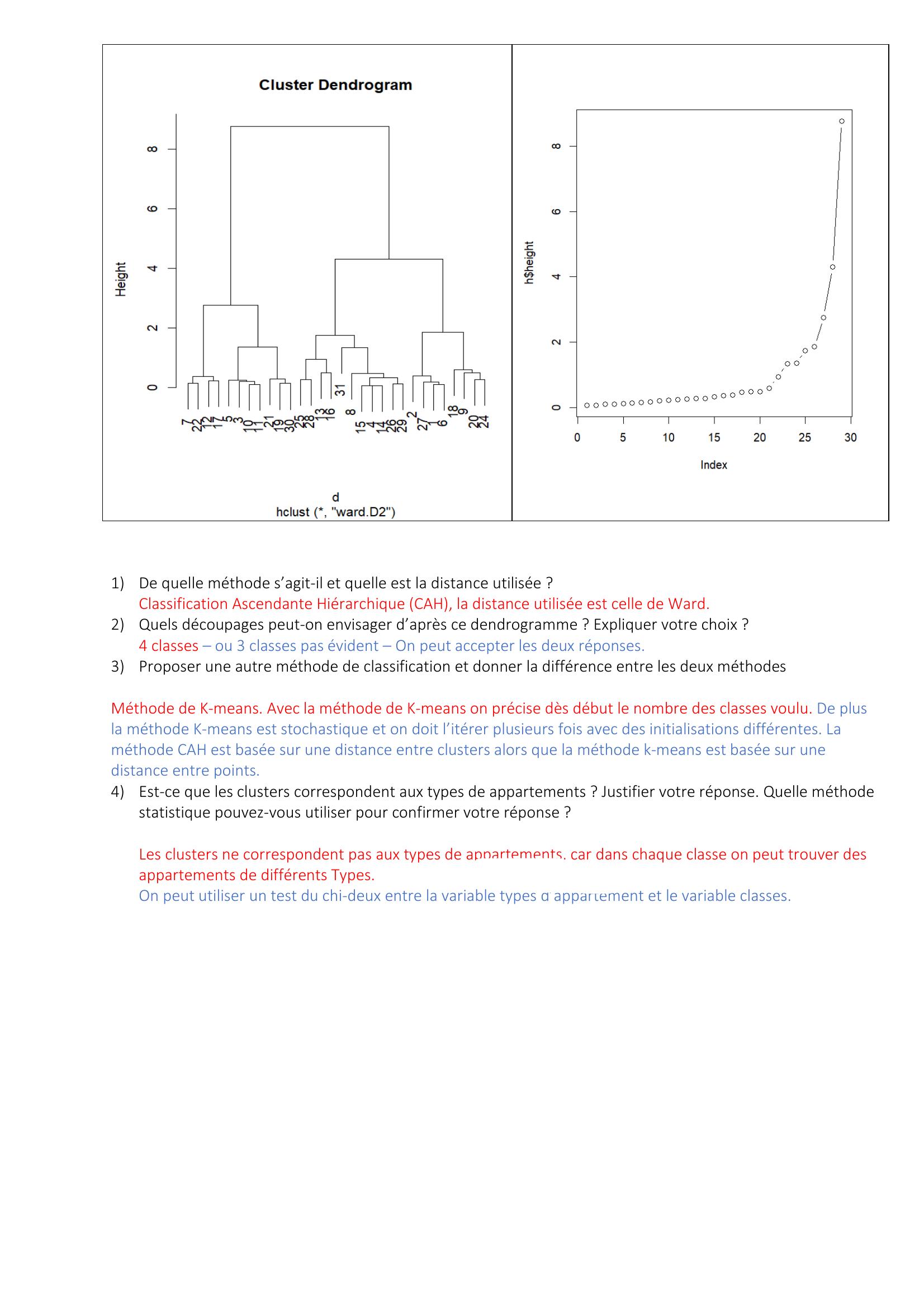 Page 4 : 1 De quelle méthode s’agit-il et quelle est la distance utilisée ? Classification Ascendante Hiérarchique CAH, la distance utilisée est celle de Ward. 2 Quels découpages peut-on envisager d’après ce dendrogramme ? Expliquer votre choix ? 4 classes – ou 3 classes pas évident – On peut accepter les deux réponses. 3 Proposer une autre méthode de classification et donner la différence entre les deux méthodes Méthode de K-means. Avec la méthode de K-means on précise dès début le nombre des classes voulu. De plus la méthode K-means est stochastique et on doit l’itérer plusieurs fois avec des initialisations différentes. La méthode CAH est basée sur une distance entre clusters alors que la méthode k-means est basée sur une distance entre points. 4 Est-ce que les clusters correspondent aux types de appartements ? Justifier votre réponse. Quelle méthode statistique pouvez-vous utiliser pour confirmer votre réponse ? Les clusters ne correspondent pas aux types de appartements, car dans chaque classe on peut trouver des appartements de différents Types. On peut utiliser l’ACP pour confirmer notre réponse. On peut utiliser un test du chi-deux entre la variable types d’appartement et le variable classes.