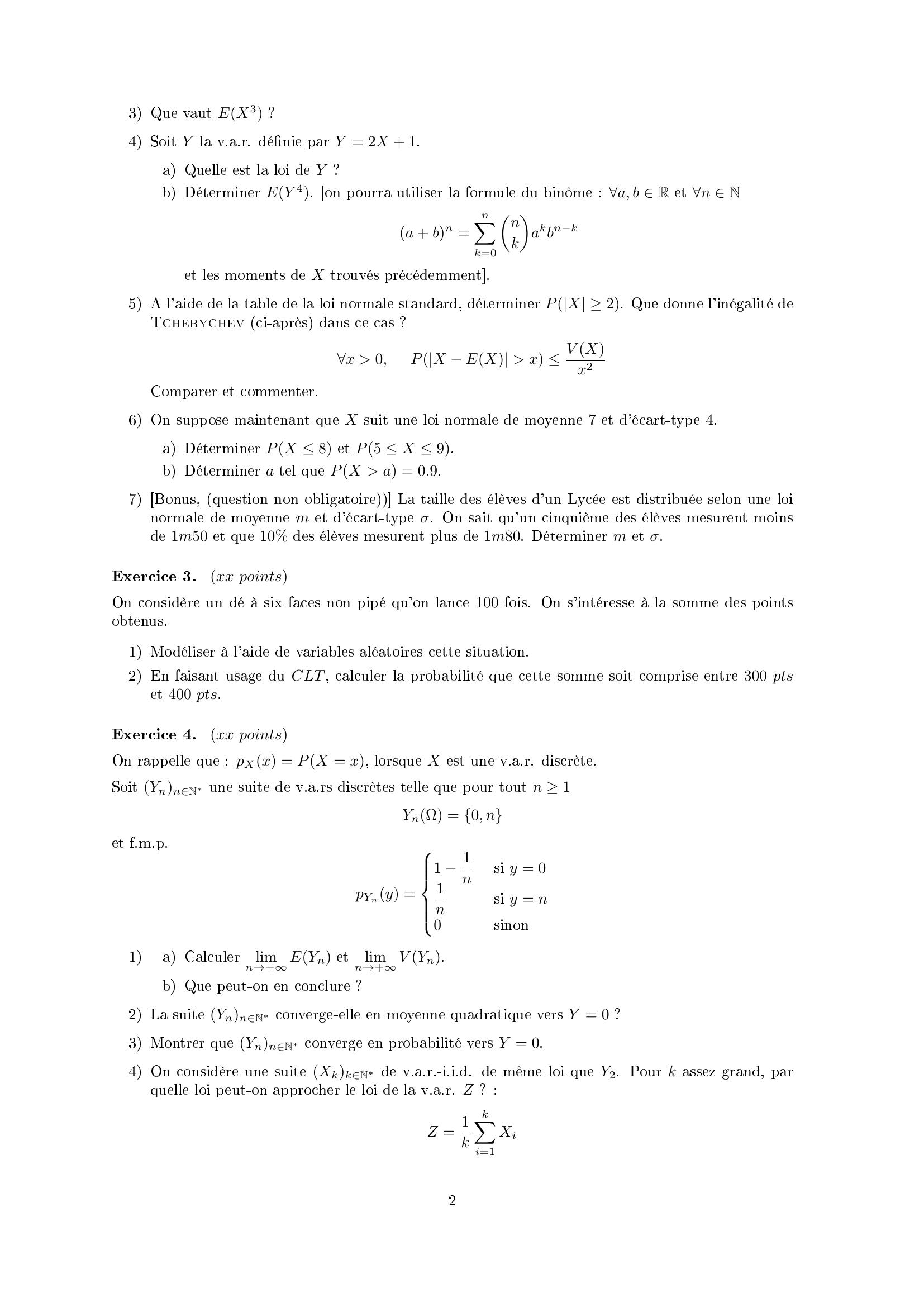 Page 2 : 3 Que vaut EX3 ?4 Soit Y la v.a.r. dénie par Y = 2X + 1.a Quelle est la loi de Y ?b Déterminer EY 4. on pourra utiliser la formule du binôme : a, b R et n Na + bn =nXk=0nkakbnket les moments de X trouvés précédemment.5 A l'aide de la table de la loi normale standard, déterminer PX 2. Que donne l'inégalité deTchebychev ci-après dans ce cas ?x 0,PX EX x V Xx2Comparer et commenter.6 On suppose maintenant que X suit une loi normale de moyenne 7 et d'écart-type 4.a Déterminer PX 8 et P5 X 9.b Déterminer a tel que PX a = 0.9.7 Bonus, question non obligatoire La taille des élèves d'un Lycée est distribuée selon une loinormale de moyenne m et d'écart-type σ. On sait qu'un cinquième des élèves mesurent moinsde 1m50 et que 10 des élèves mesurent plus de 1m80. Déterminer m et σ.Exercice 3.xx pointsOn considère un dé à six faces non pipé qu'on lance 100 fois. On s'intéresse à la somme des pointsobtenus.1 Modéliser à l'aide de variables aléatoires cette situation.2 En faisant usage du CLT, calculer la probabilité que cette somme soit comprise entre 300 ptset 400 pts.Exercice 4.xx pointsOn rappelle que : pXx = PX = x, lorsque X est une v.a.r. discrète.Soit YnnNune suite de v.a.rs discrètes telle que pour tout n 1YnΩ = 0, net f.m.p.pYny =1 1nsi y = 01nsi y = n0sinon1a Calculerlimn→+EYn etlimn→+V Yn.b Que peut-on en conclure ?2 La suite YnnNconverge-elle en moyenne quadratique vers Y = 0 ?3 Montrer que YnnNconverge en probabilité vers Y = 0.4 On considère une suite XkkNde v.a.r.-i.i.d. de même loi que Y2. Pour k assez grand, parquelle loi peut-on approcher le loi de la v.a.r. Z ? :Z = 1kkXi=1Xi2