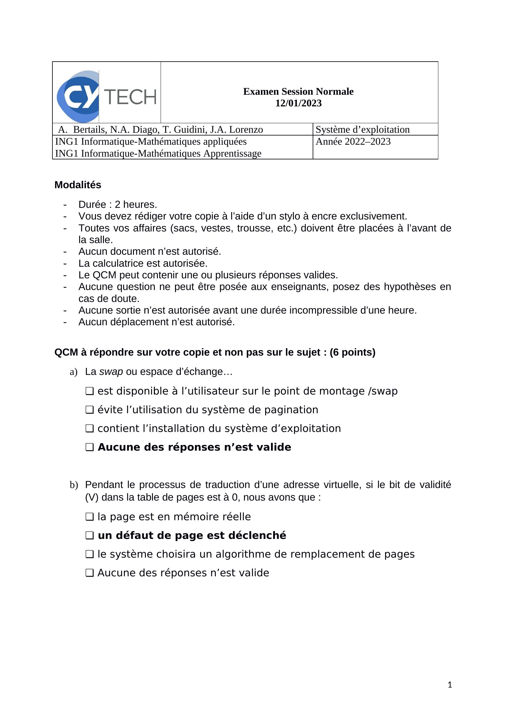 Page 1 : Examen Session Normale12/01/2023A. Bertails, N.A. Diago, T. Guidini, J.A. LorenzoSystème d’exploitationING1 Informatique-Mathématiques appliquéesING1 Informatique-Mathématiques ApprentissageAnnée 2022–2023Modalités֊Durée : 2 heures.֊Vous devez rédiger votre copie à l’aide d’un stylo à encre exclusivement.֊Toutes vos affaires sacs, vestes, trousse, etc. doivent être placées à l’avant dela salle.֊Aucun document n’est autorisé.֊La calculatrice est autorisée.֊Le QCM peut contenir une ou plusieurs réponses valides.֊Aucune question ne peut être posée aux enseignants, posez des hypothèses encas de doute.֊Aucune sortie n’est autorisée avant une durée incompressible d’une heure.֊Aucun déplacement n’est autorisé.QCM à répondre sur votre copie et non pas sur le sujet: 6 pointsa La swap ou espace d’échange…❏ est disponible à l’utilisateur sur le point de montage /swap❏ évite l’utilisation du système de pagination❏ contient l’installation du système d’exploitation❏ Aucune des réponses n’est valideb Pendant le processus de traduction d’une adresse virtuelle, si le bit de validitéV dans la table de pages est à 0, nous avons que : ❏ la page est en mémoire réelle❏ un défaut de page est déclenché❏ le système choisira un algorithme de remplacement de pages❏ Aucune des réponses n’est valide1