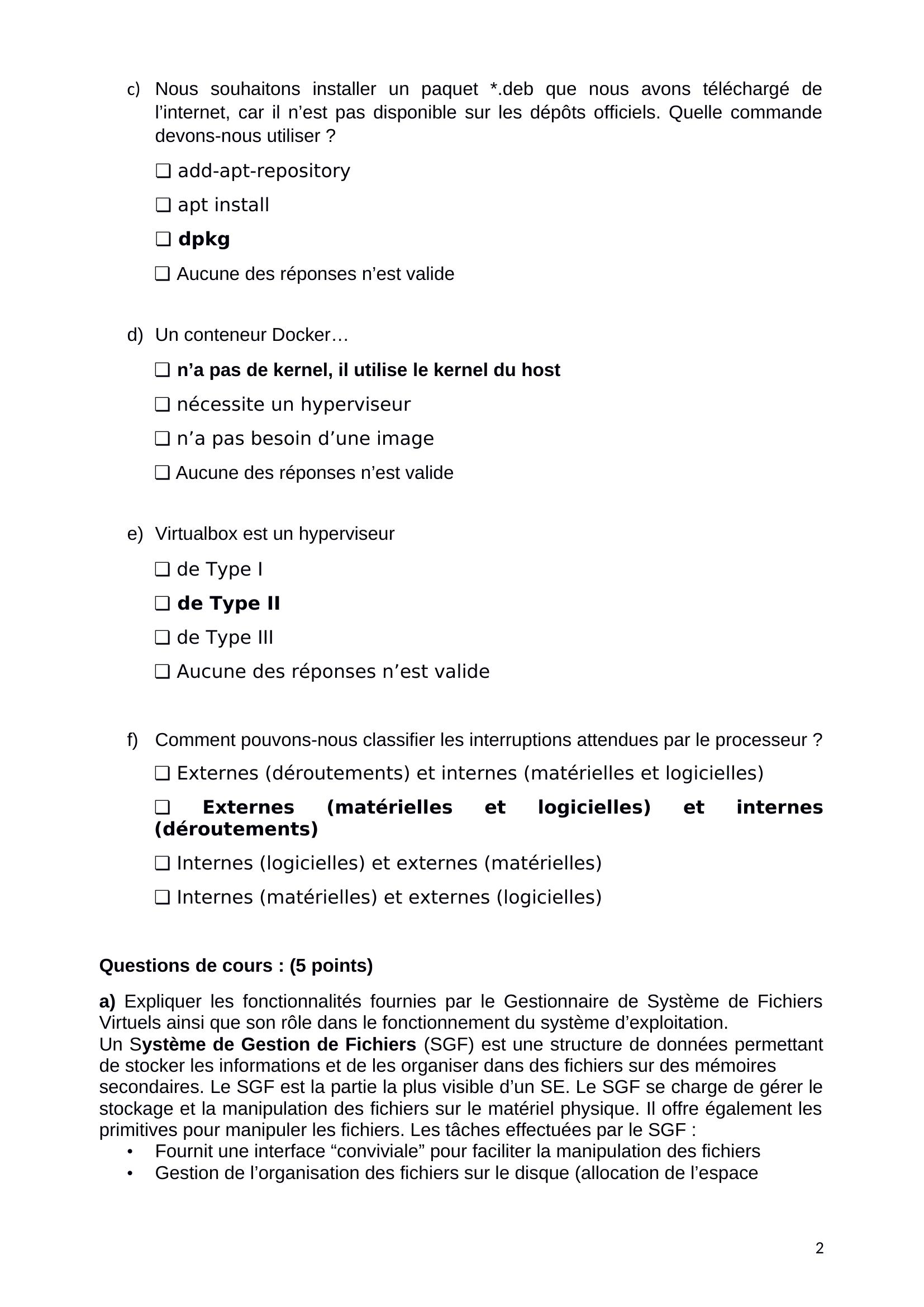 Page 2 : c Nous souhaitons installer un paquet .deb que nous avons téléchargé del’internet, car il n’est pas disponible sur les dépôts officiels. Quelle commandedevons-nous utiliser ? ❏ add-apt-repository❏ apt install❏ dpkg❏ Aucune des réponses n’est valided Un conteneur Docker…❏ n’a pas de kernel, il utilise le kernel du host❏ nécessite un hyperviseur❏ n’a pas besoin d’une image❏ Aucune des réponses n’est validee Virtualbox est un hyperviseur ❏ de Type I❏ de Type II❏ de Type III❏ Aucune des réponses n’est validefComment pouvons-nous classifier les interruptions attendues par le processeur ?❏ Externes déroutements et internes matérielles et logicielles❏ Externes matérielles et logicielles et internesdéroutements❏ Internes logicielles et externes matérielles❏ Internes matérielles et externes logicielles Questions de cours: 5 pointsa Expliquer les fonctionnalités fournies par le Gestionnaire de Système de FichiersVirtuels ainsi que son rôle dans le fonctionnement du système d’exploitation.Un Système de Gestion de Fichiers SGF est une structure de données permettantde stocker les informations et de les organiser dans des fichiers sur des mémoiressecondaires. Le SGF est la partie la plus visible d’un SE. Le SGF se charge de gérer lestockage et la manipulation des fichiers sur le matériel physique. Il offre également lesprimitives pour manipuler les fichiers. Les tâches effectuées par le SGF :•Fournit une interface “conviviale” pour faciliter la manipulation des fichiers•Gestion de l’organisation des fichiers sur le disque allocation de l’espace2