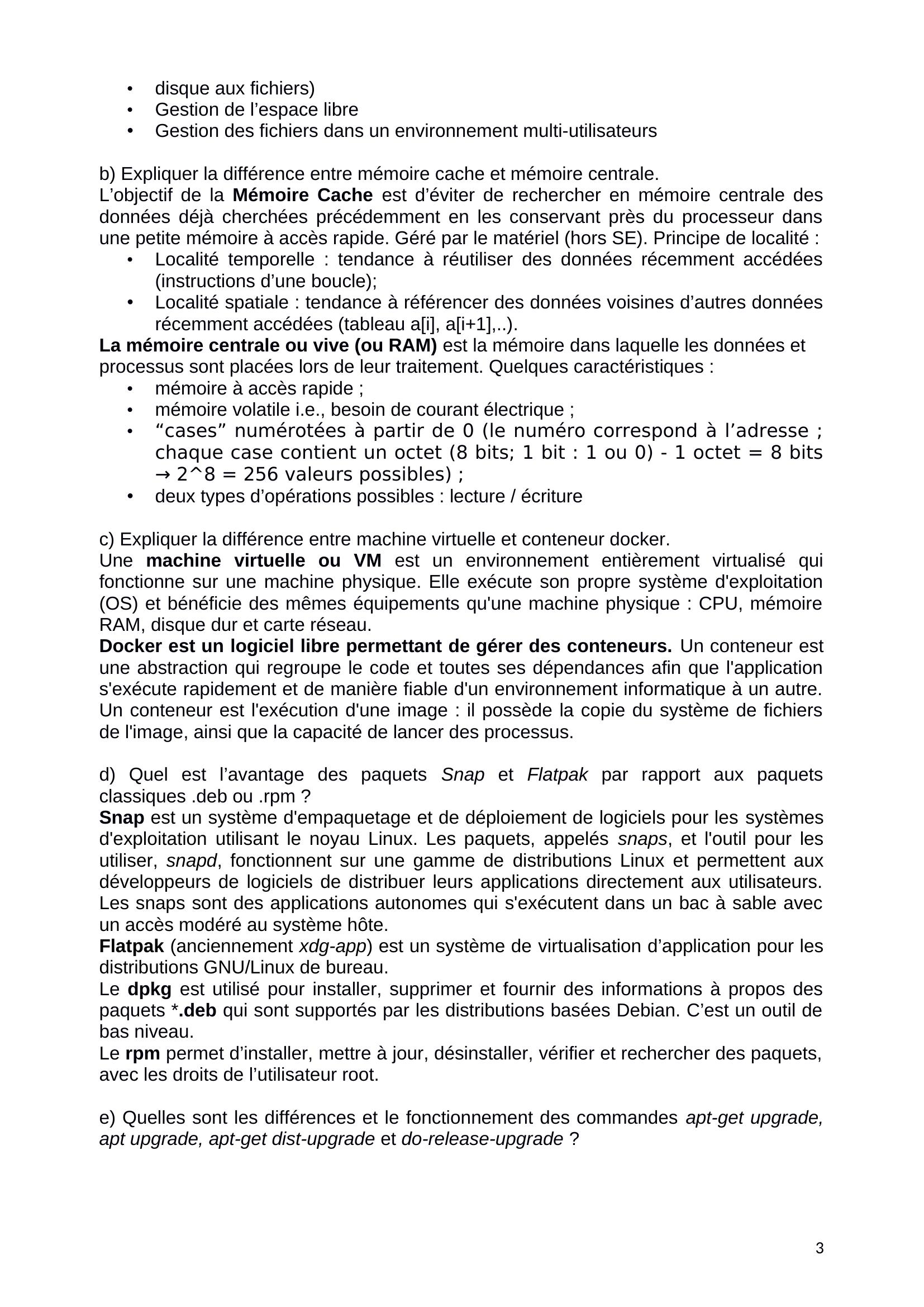 Page 3 : •disque aux fichiers•Gestion de l’espace libre•Gestion des fichiers dans un environnement multi-utilisateursb Expliquer la différence entre mémoire cache et mémoire centrale. L’objectif de la Mémoire Cache est d’éviter de rechercher en mémoire centrale desdonnées déjà cherchées précédemment en les conservant près du processeur dansune petite mémoire à accès rapide. Géré par le matériel hors SE. Principe de localité :•Localité temporelle : tendance à réutiliser des données récemment accédéesinstructions d’une boucle;•Localité spatiale : tendance à référencer des données voisines d’autres donnéesrécemment accédées tableau ai, ai+1,...La mémoire centrale ou vive ou RAM est la mémoire dans laquelle les données etprocessus sont placées lors de leur traitement. Quelques caractéristiques : •mémoire à accès rapide ; •mémoire volatile i.e., besoin de courant électrique ; •“cases” numérotées à partir de 0 le numéro correspond à l’adresse ;chaque case contient un octet 8 bits; 1 bit : 1 ou 0 - 1 octet = 8 bits→ 2^8 = 256 valeurs possibles ; •deux types d’opérations possibles : lecture / écriturec Expliquer la différence entre machine virtuelle et conteneur docker. Une machine virtuelle ou VM est un environnement entièrement virtualisé quifonctionne sur une machine physique. Elle exécute son propre système d'exploitationOS et bénéficie des mêmes équipements qu'une machine physique : CPU, mémoireRAM, disque dur et carte réseau.Docker est un logiciel libre permettant de gérer des conteneurs. Un conteneur estune abstraction qui regroupe le code et toutes ses dépendances afin que l'applications'exécute rapidement et de manière fiable d'un environnement informatique à un autre.Un conteneur est l'exécution d'une image : il possède la copie du système de fichiersde l'image, ainsi que la capacité de lancer des processus.d Quel est l’avantage des paquets Snap et Flatpak par rapport aux paquetsclassiques .deb ou .rpm ?Snap est un système d'empaquetage et de déploiement de logiciels pour les systèmesd'exploitation utilisant le noyau Linux. Les paquets, appelés snaps, et l'outil pour lesutiliser, snapd, fonctionnent sur une gamme de distributions Linux et permettent auxdéveloppeurs de logiciels de distribuer leurs applications directement aux utilisateurs.Les snaps sont des applications autonomes qui s'exécutent dans un bac à sable avecun accès modéré au système hôte. Flatpak anciennement xdg-app est un système de virtualisation d’application pour lesdistributions GNU/Linux de bureau. Le dpkg est utilisé pour installer, supprimer et fournir des informations à propos despaquets .deb qui sont supportés par les distributions basées Debian. C’est un outil debas niveau. Le rpm permet d’installer, mettre à jour, désinstaller, vérifier et rechercher des paquets,avec les droits de l’utilisateur root.e Quelles sont les différences et le fonctionnement des commandes apt-get upgrade,apt upgrade, apt-get dist-upgrade et do-release-upgrade ?3