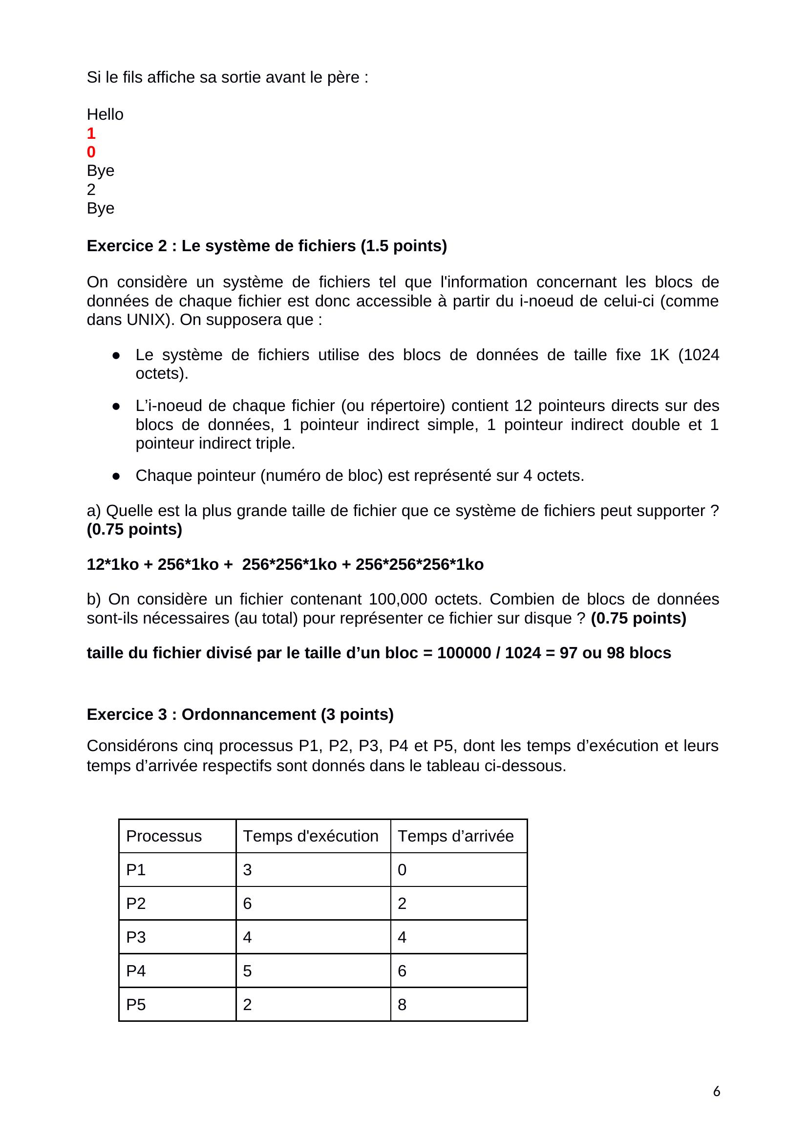 Page 6 : Si le fils affiche sa sortie avant le père : Hello10Bye2ByeExercice 2: Le système de fichiers 1.5 pointsOn considère un système de fichiers tel que l'information concernant les blocs dedonnées de chaque fichier est donc accessible à partir du i-noeud de celui-ci commedans UNIX. On supposera que :●Le système de fichiers utilise des blocs de données de taille fixe 1K 1024octets.●L’i-noeud de chaque fichier ou répertoire contient 12 pointeurs directs sur desblocs de données, 1 pointeur indirect simple, 1 pointeur indirect double et 1pointeur indirect triple.●Chaque pointeur numéro de bloc est représenté sur 4 octets.a Quelle est la plus grande taille de fichier que ce système de fichiers peut supporter ?0.75 points121ko + 2561ko + 2562561ko + 2562562561kob On considère un fichier contenant 100,000 octets. Combien de blocs de donnéessont-ils nécessaires au total pour représenter ce fichier sur disque ? 0.75 pointstaille du fichier divisé par le taille d’un bloc = 100000 / 1024 = 97 ou 98 blocs Exercice 3: Ordonnancement 3 pointsConsidérons cinq processus P1, P2, P3, P4 et P5, dont les temps d’exécution et leurstemps d’arrivée respectifs sont donnés dans le tableau ci-dessous. Processus Temps d'exécutionTemps d’arrivéeP130P262P344P456P5286