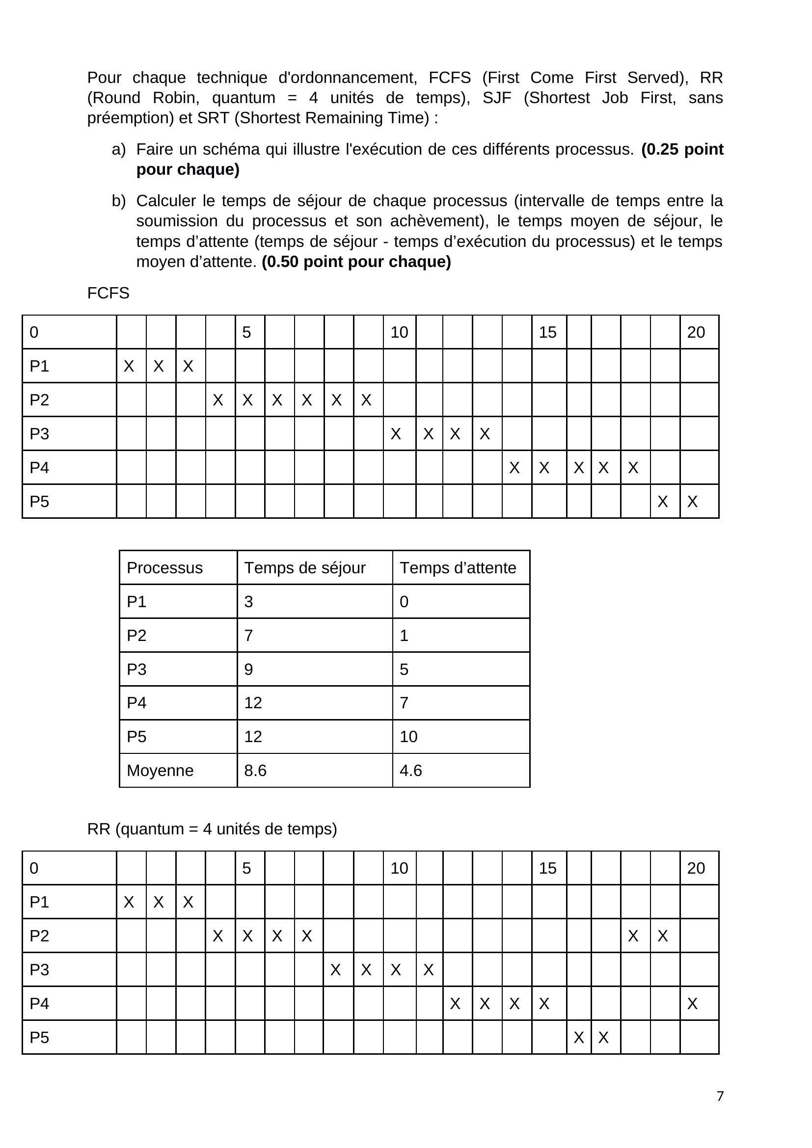 Page 7 : Pour chaque technique d'ordonnancement, FCFS First Come First Served, RRRound Robin, quantum = 4 unités de temps, SJF Shortest Job First, sanspréemption et SRT Shortest Remaining Time :a Faire un schéma qui illustre l'exécution de ces différents processus. 0.25 pointpour chaqueb Calculer le temps de séjour de chaque processus intervalle de temps entre lasoumission du processus et son achèvement, le temps moyen de séjour, letemps d’attente temps de séjour - temps d’exécution du processus et le tempsmoyen d’attente. 0.50 point pour chaqueFCFS05101520P1XXXP2XXXXXXP3XXXXP4XXXXXP5XXProcessus Temps de séjourTemps d’attenteP130P271P395P4127P51210Moyenne8.64.6RR quantum = 4 unités de temps05101520P1XXXP2XXXXXXP3XXXXP4XXXXXP5XX7