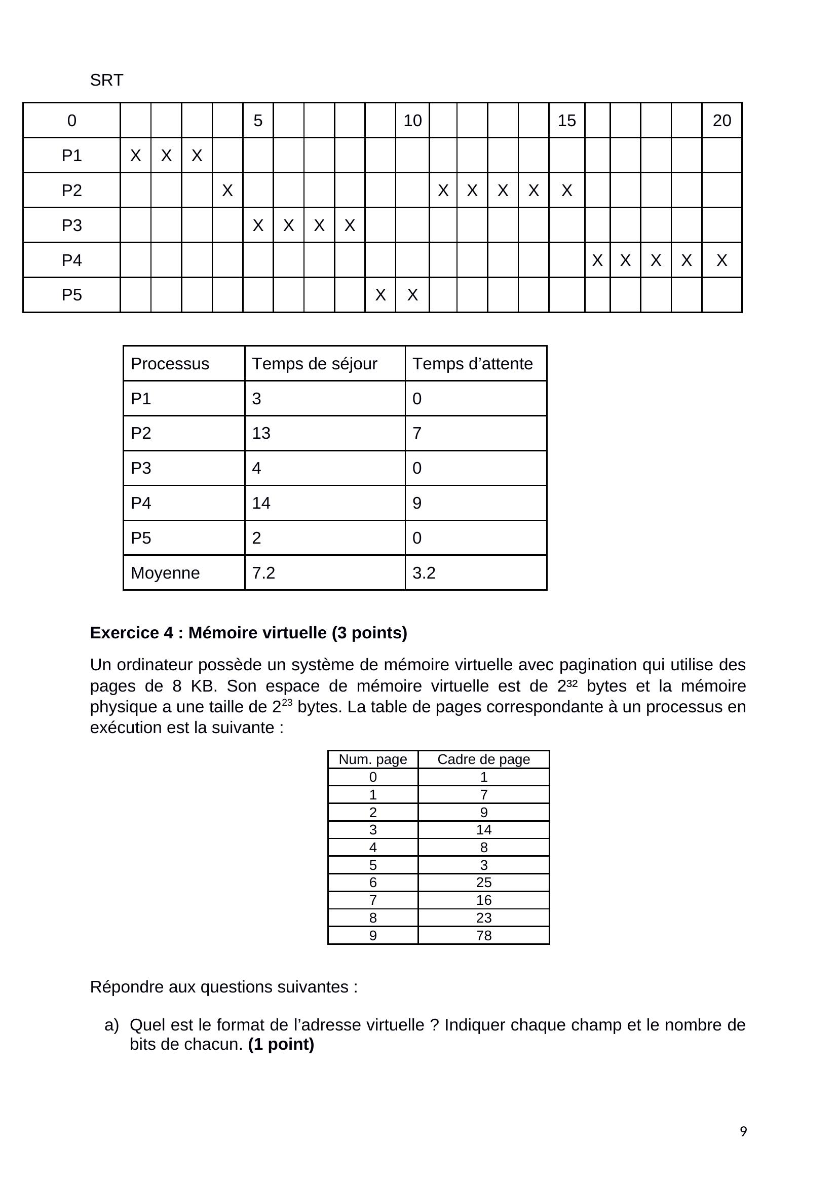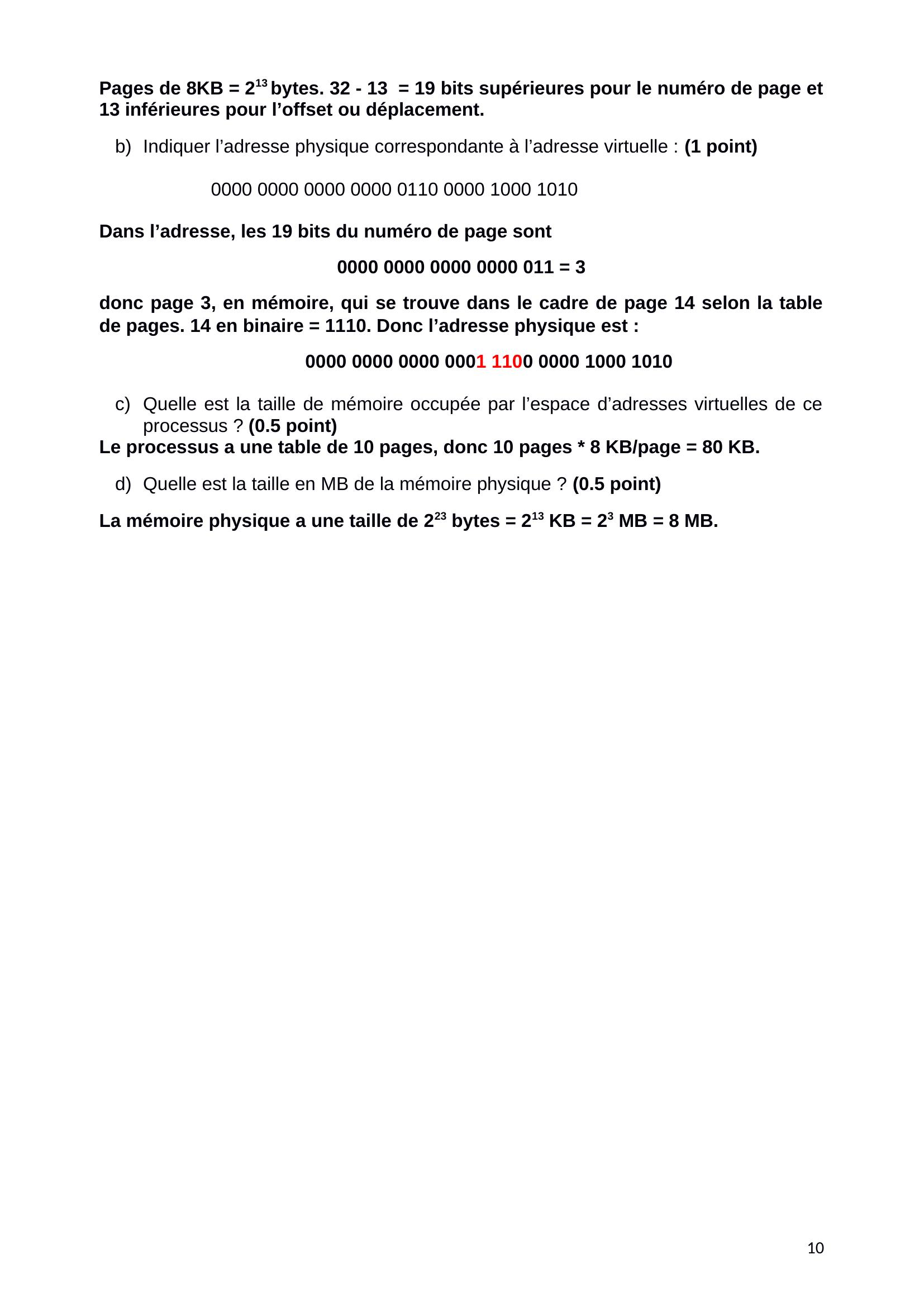 Page 10 : Pages de 8KB = 213 bytes. 32 - 13 = 19 bits supérieures pour le numéro de page et13 inférieures pour l’offset ou déplacement. b Indiquer l’adresse physique correspondante à l’adresse virtuelle : 1 point 0000 0000 0000 0000 0110 0000 1000 1010Dans l’adresse, les 19 bits du numéro de page sont0000 0000 0000 0000 011 = 3donc page 3, en mémoire, qui se trouve dans le cadre de page 14 selon la tablede pages. 14 en binaire = 1110. Donc l’adresse physique est : 0000 0000 0000 0001 1100 0000 1000 1010c Quelle est la taille de mémoire occupée par l’espace d’adresses virtuelles de ceprocessus ? 0.5 point Le processus a une table de 10 pages, donc 10 pages 8 KB/page = 80 KB.d Quelle est la taille en MB de la mémoire physique ? 0.5 point La mémoire physique a une taille de 223 bytes = 213 KB = 23 MB = 8 MB.10