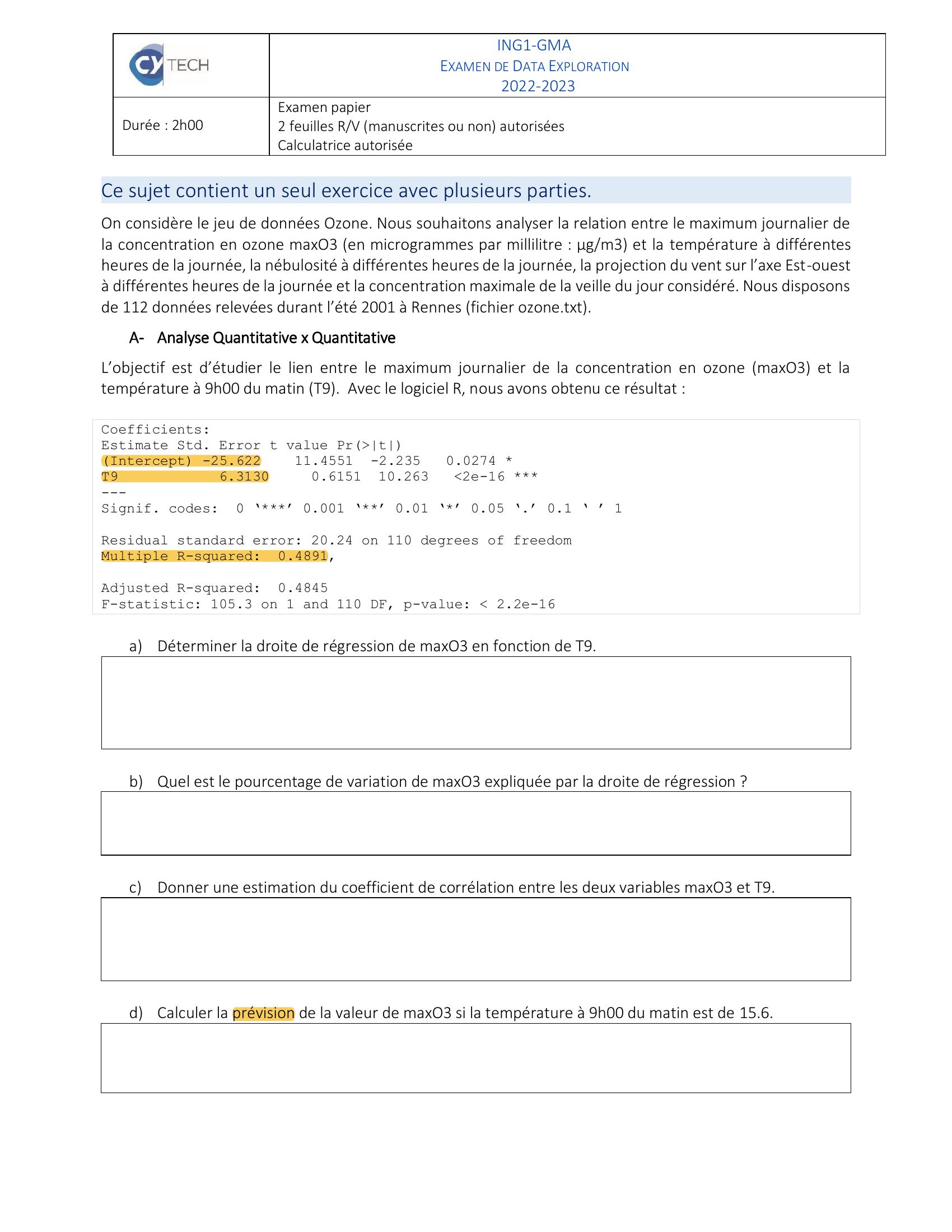 Page 1 : ING1-GMA EXAMEN DE DATA EXPLORATION 2022-2023 Durée : 2h00 Examen papier 2 feuilles R/V manuscrites ou non autorisées Calculatrice autorisée Ce sujet contient un seul exercice avec plusieurs parties. On considère le jeu de données Ozone. Nous souhaitons analyser la relation entre le maximum journalier de la concentration en ozone maxO3 en microgrammes par millilitre : µg/m3 et la température à différentes heures de la journée, la nébulosité à différentes heures de la journée, la projection du vent sur l’axe Est-ouest à différentes heures de la journée et la concentration maximale de la veille du jour considéré. Nous disposons de 112 données relevées durant l’été 2001 à Rennes fichier ozone.txt. A- Analyse Quantitative x Quantitative L’objectif est d’étudier le lien entre le maximum journalier de la concentration en ozone maxO3 et la température à 9h00 du matin T9. Avec le logiciel R, nous avons obtenu ce résultat : Coefficients: Estimate Std. Error t value Prt Intercept -25.622 11.4551 -2.235 0.0274 T9 6.3130 0.6151 10.263 2e-16 --- Signif. codes: 0 ‘’ 0.001 ‘’ 0.01 ‘’ 0.05 ‘.’ 0.1 ‘ ’ 1 Residual standard error: 20.24 on 110 degrees of freedom Multiple R-squared: 0.4891, Adjusted R-squared: 0.4845 F-statistic: 105.3 on 1 and 110 DF, p-value: 2.2e-16 a Déterminer la droite de régression de maxO3 en fonction de T9. b Quel est le pourcentage de variation de maxO3 expliquée par la droite de régression ? c Donner une estimation du coefficient de corrélation entre les deux variables maxO3 et T9. d Calculer la prévision de la valeur de maxO3 si la température à 9h00 du matin est de 15.6.