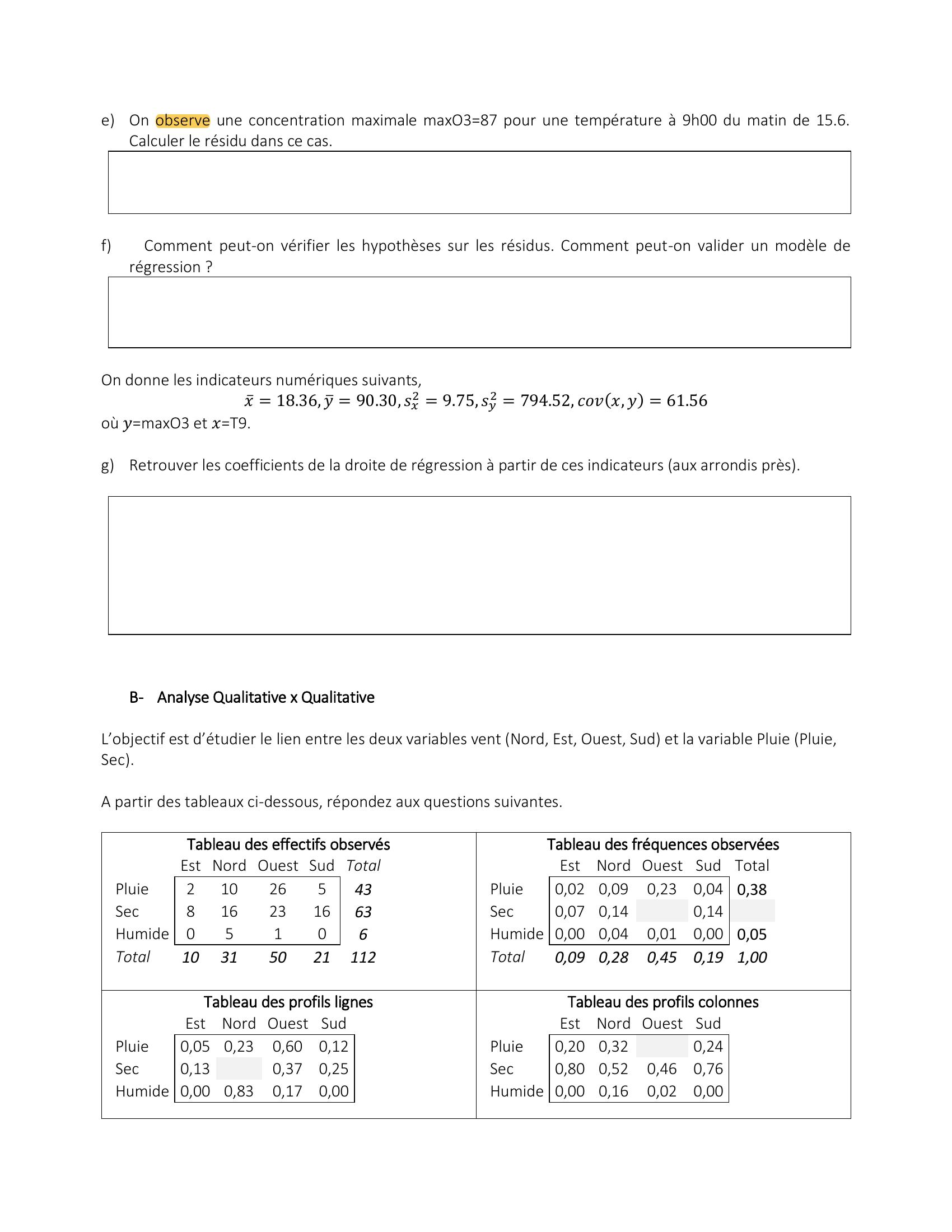 Page 2 : e On observe une concentration maximale maxO3=87 pour une température à 9h00 du matin de 15.6. Calculer le résidu dans ce cas. f Comment peut-on vérifier les hypothèses sur les résidus. Comment peut-on valider un modèle de régression ? On donne les indicateurs numériques suivants, 𝑥̅ = 18.36, 𝑦̅ = 90.30, 𝑠𝑥2 = 9.75, 𝑠𝑦2 = 794.52, 𝑐𝑜𝑣𝑥, 𝑦 = 61.56 où 𝑦=maxO3 et 𝑥=T9. g Retrouver les coefficients de la droite de régression à partir de ces indicateurs aux arrondis près. B- Analyse Qualitative x Qualitative L’objectif est d’étudier le lien entre les deux variables vent Nord, Est, Ouest, Sud et la variable Pluie Pluie, Sec. A partir des tableaux ci-dessous, répondez aux questions suivantes. Tableau des effectifs observés Est Nord Ouest Sud Total Pluie 2 10 26 5 43 Sec 8 16 23 16 63 Humide 0 5 1 0 6 Total 10 31 50 21 112 Tableau des fréquences observées Est Nord Ouest Sud Total Pluie 0,02 0,09 0,23 0,04 0,38 Sec 0,07 0,14 0,14 Humide 0,00 0,04 0,01 0,00 0,05 Total 0,09 0,28 0,45 0,19 1,00 Tableau des profils lignes Est Nord Ouest Sud Pluie 0,05 0,23 0,60 0,12 Sec 0,13 0,37 0,25 Humide 0,00 0,83 0,17 0,00 . Tableau des profils colonnes Est Nord Ouest Sud Pluie 0,20 0,32 0,24 Sec 0,80 0,52 0,46 0,76 Humide 0,00 0,16 0,02 0,00