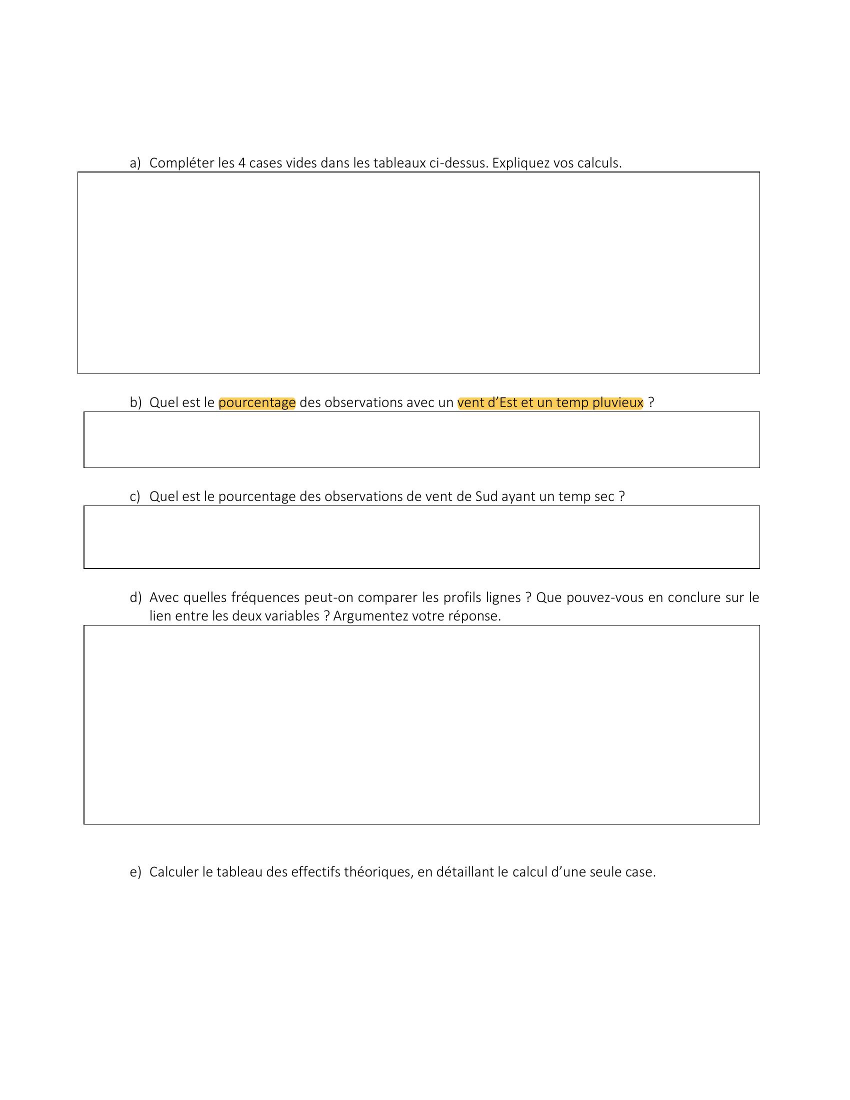 Page 3 : a Compléter les 4 cases vides dans les tableaux ci-dessus. Expliquez vos calculs. b Quel est le pourcentage des observations avec un vent d’Est et un temp pluvieux ? c Quel est le pourcentage des observations de vent de Sud ayant un temp sec ? d Avec quelles fréquences peut-on comparer les profils lignes ? Que pouvez-vous en conclure sur le lien entre les deux variables ? Argumentez votre réponse. e Calculer le tableau des effectifs théoriques, en détaillant le calcul d’une seule case.
