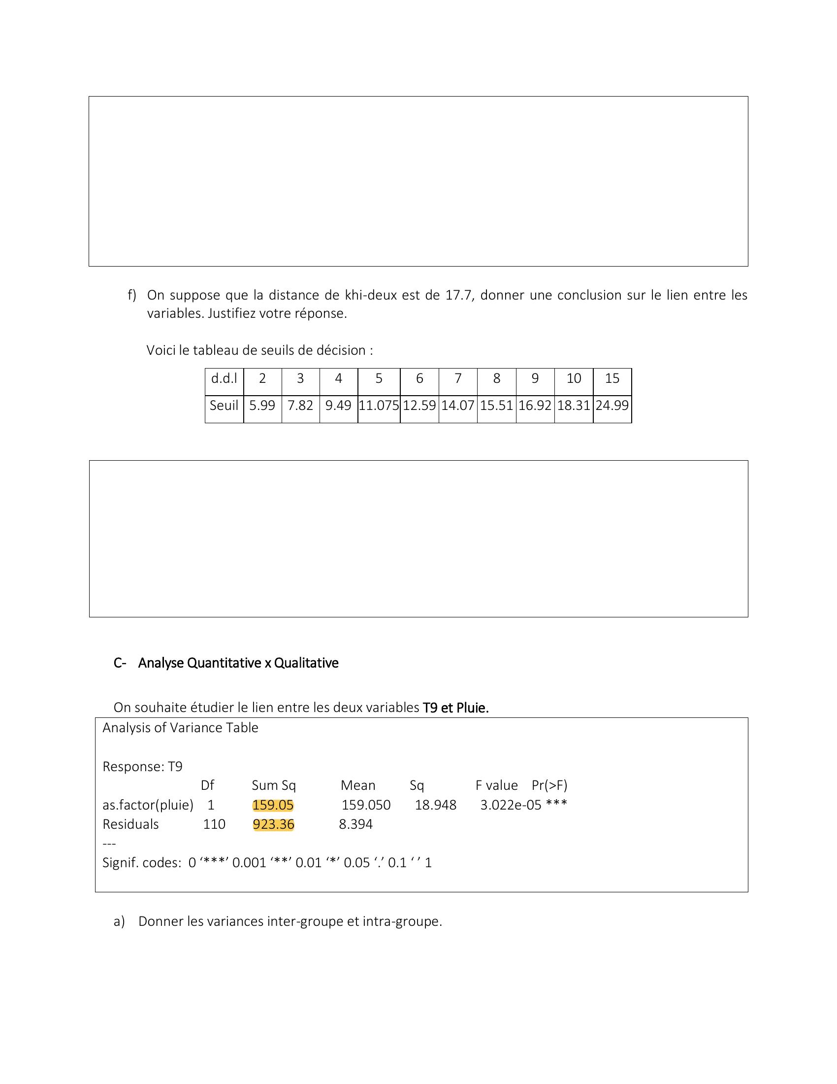 Page 4 : f On suppose que la distance de khi-deux est de 17.7, donner une conclusion sur le lien entre les variables. Justifiez votre réponse. Voici le tableau de seuils de décision : d.d.l 2 3 4 5 6 7 8 9 10 15 Seuil 5.99 7.82 9.49 11.075 12.59 14.07 15.51 16.92 18.31 24.99 C- Analyse Quantitative x Qualitative On souhaite étudier le lien entre les deux variables T9 et Pluie. Analysis of Variance Table Response: T9 Df Sum Sq Mean Sq F value PrF as.factorpluie 1 159.05 159.050 18.948 3.022e-05 Residuals 110 923.36 8.394 --- Signif. codes: 0 ‘’ 0.001 ‘’ 0.01 ‘’ 0.05 ‘.’ 0.1 ‘ ’ 1 a Donner les variances inter-groupe et intra-groupe.