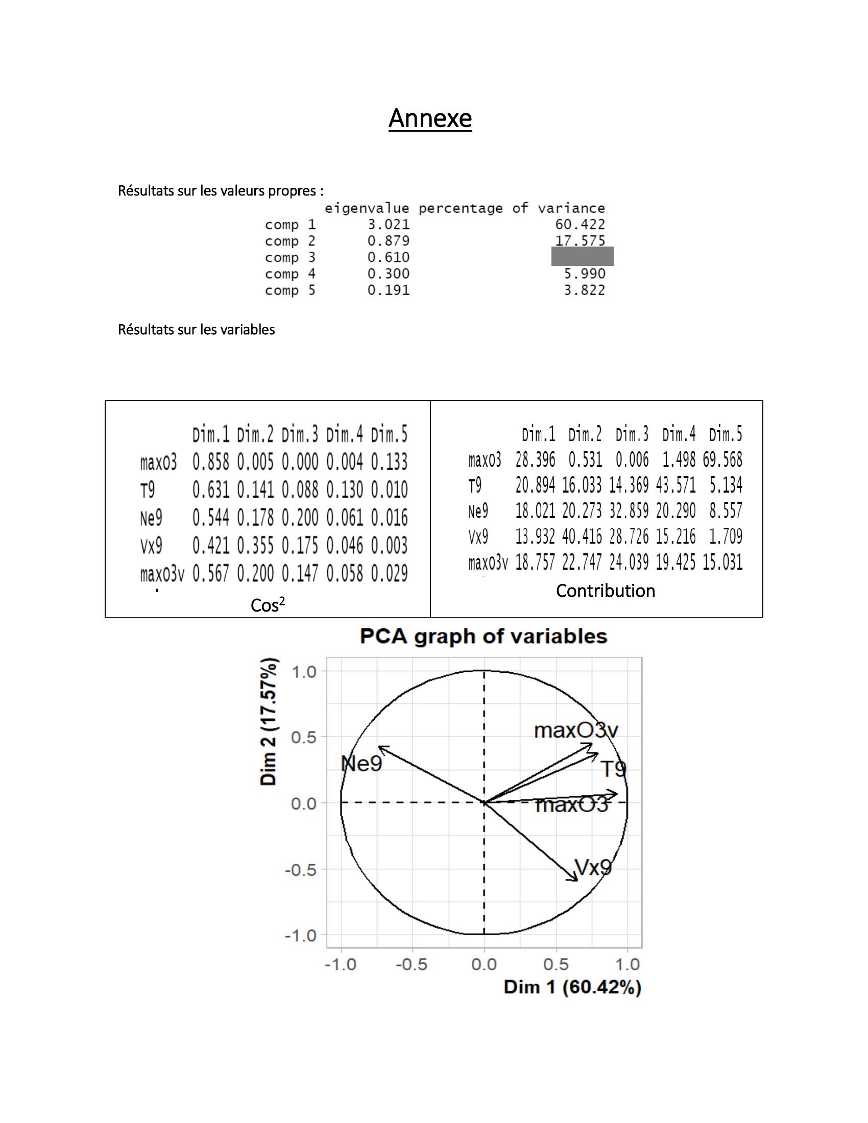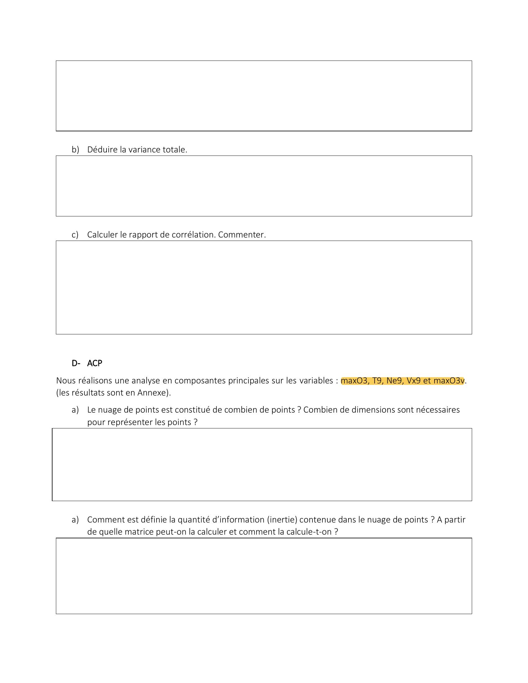 Page 5 : b Déduire la variance totale. c Calculer le rapport de corrélation. Commenter. D- ACP Nous réalisons une analyse en composantes principales sur les variables : maxO3, T9, Ne9, Vx9 et maxO3v. les résultats sont en Annexe. a Le nuage de points est constitué de combien de points ? Combien de dimensions sont nécessaires pour représenter les points ? a Comment est définie la quantité d’information inertie contenue dans le nuage de points ? A partir de quelle matrice peut-on la calculer et comment la calcule-t-on ?