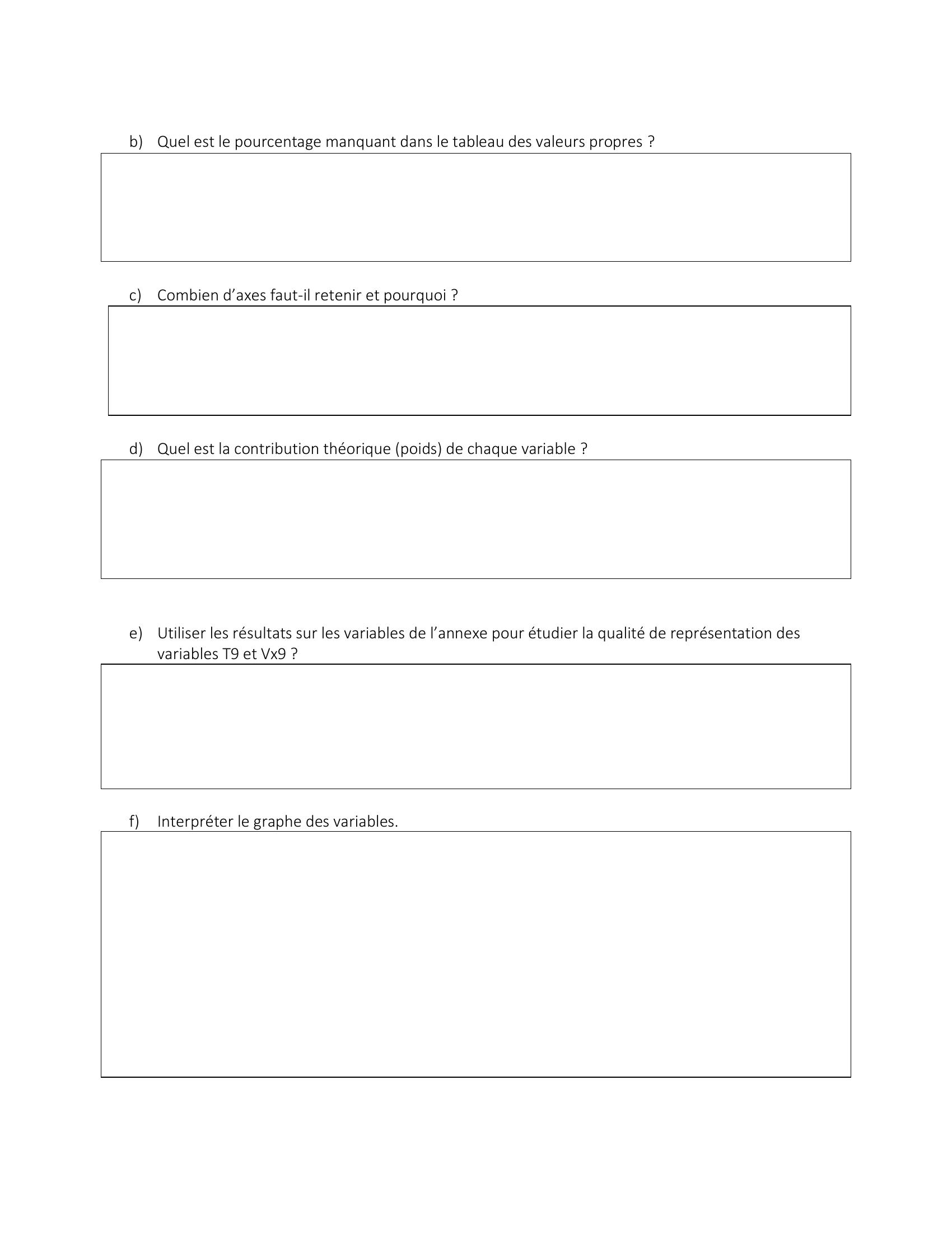 Page 6 : b Quel est le pourcentage manquant dans le tableau des valeurs propres ? c Combien d’axes faut-il retenir et pourquoi ? d Quel est la contribution théorique poids de chaque variable ? e Utiliser les résultats sur les variables de l’annexe pour étudier la qualité de représentation des variables T9 et Vx9 ? f Interpréter le graphe des variables.