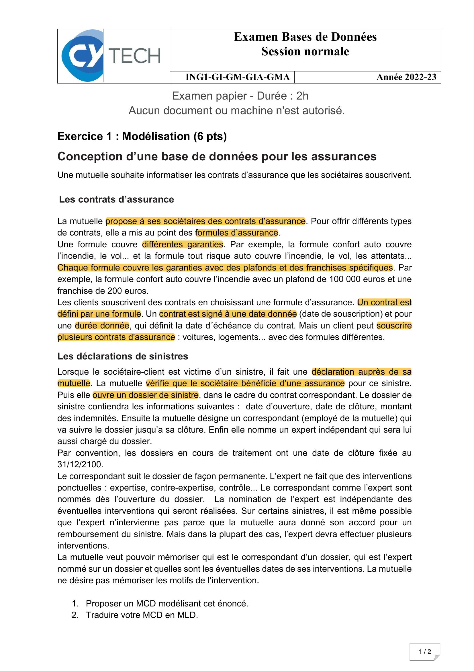 Page 1 : Examen Bases de Données Session normale ING1-GI-GM-GIA-GMA Année 2022-23 1 / 2 Examen papier - Durée : 2h Aucun document ou machine n'est autorisé. Exercice 1 : Modélisation 6 pts Conception d’une base de données pour les assurances Une mutuelle souhaite informatiser les contrats d’assurance que les sociétaires souscrivent. Les contrats d’assurance La mutuelle propose à ses sociétaires des contrats d’assurance. Pour offrir différents types de contrats, elle a mis au point des formules d’assurance. Une formule couvre différentes garanties. Par exemple, la formule confort auto couvre l’incendie, le vol... et la formule tout risque auto couvre l’incendie, le vol, les attentats... Chaque formule couvre les garanties avec des plafonds et des franchises spécifiques. Par exemple, la formule confort auto couvre l’incendie avec un plafond de 100 000 euros et une franchise de 200 euros. Les clients souscrivent des contrats en choisissant une formule d’assurance. Un contrat est défini par une formule. Un contrat est signé à une date donnée date de souscription et pour une durée donnée, qui définit la date déchéance du contrat. Mais un client peut souscrire plusieurs contrats d'assurance : voitures, logements... avec des formules différentes. Les déclarations de sinistres Lorsque le sociétaire-client est victime d’un sinistre, il fait une déclaration auprès de sa mutuelle. La mutuelle vérifie que le sociétaire bénéficie d’une assurance pour ce sinistre. Puis elle ouvre un dossier de sinistre, dans le cadre du contrat correspondant. Le dossier de sinistre contiendra les informations suivantes : date d’ouverture, date de clôture, montant des indemnités. Ensuite la mutuelle désigne un correspondant employé de la mutuelle qui va suivre le dossier jusqu’a sa clôture. Enfin elle nomme un expert indépendant qui sera lui aussi chargé du dossier. Par convention, les dossiers en cours de traitement ont une date de clôture fixée au 31/12/2100. Le correspondant suit le dossier de façon permanente. L’expert ne fait que des interventions ponctuelles : expertise, contre-expertise, contrôle... Le correspondant comme l’expert sont nommés dès l’ouverture du dossier. La nomination de l’expert est indépendante des éventuelles interventions qui seront réalisées. Sur certains sinistres, il est même possible que l’expert n’intervienne pas parce que la mutuelle aura donné son accord pour un remboursement du sinistre. Mais dans la plupart des cas, l’expert devra effectuer plusieurs interventions. La mutuelle veut pouvoir mémoriser qui est le correspondant d’un dossier, qui est l’expert nommé sur un dossier et quelles sont les éventuelles dates de ses interventions. La mutuelle ne désire pas mémoriser les motifs de l’intervention. 1. Proposer un MCD modélisant cet énoncé. 2. Traduire votre MCD en MLD.