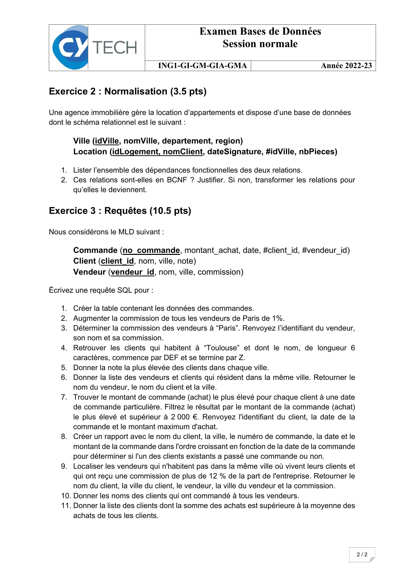 Page 2 : Examen Bases de Données Session normale ING1-GI-GM-GIA-GMA Année 2022-23 2 / 2 Exercice 2 : Normalisation 3.5 pts Une agence immobilière gère la location d’appartements et dispose d’une base de données dont le schéma relationnel est le suivant : Ville idVille, nomVille, departement, region Location idLogement, nomClient, dateSignature, idVille, nbPieces 1. Lister l’ensemble des dépendances fonctionnelles des deux relations. 2. Ces relations sont-elles en BCNF ? Justifier. Si non, transformer les relations pour qu’elles le deviennent. Exercice 3 : Requêtes 10.5 pts Nous considérons le MLD suivant : Commande nocommande, montantachat, date, clientid, vendeurid Client clientid, nom, ville, note Vendeur vendeurid, nom, ville, commission Écrivez une requête SQL pour : 1. Créer la table contenant les données des commandes. 2. Augmenter la commission de tous les vendeurs de Paris de 1. 3. Déterminer la commission des vendeurs à “Paris”. Renvoyez l’identifiant du vendeur, son nom et sa commission. 4. Retrouver les clients qui habitent à “Toulouse” et dont le nom, de longueur 6 caractères, commence par DEF et se termine par Z. 5. Donner la note la plus élevée des clients dans chaque ville. 6. Donner la liste des vendeurs et clients qui résident dans la même ville. Retourner le nom du vendeur, le nom du client et la ville. 7. Trouver le montant de commande achat le plus élevé pour chaque client à une date de commande particulière. Filtrez le résultat par le montant de la commande achat le plus élevé et supérieur à 2 000 €. Renvoyez l'identifiant du client, la date de la commande et le montant maximum d'achat. 8. Créer un rapport avec le nom du client, la ville, le numéro de commande, la date et le montant de la commande dans l'ordre croissant en fonction de la date de la commande pour déterminer si l'un des clients existants a passé une commande ou non. 9. Localiser les vendeurs qui n'habitent pas dans la même ville où vivent leurs clients et qui ont reçu une commission de plus de 12 de la part de l'entreprise. Retourner le nom du client, la ville du client, le vendeur, la ville du vendeur et la commission. 10. Donner les noms des clients qui ont commandé à tous les vendeurs. 11. Donner la liste des clients dont la somme des achats est supérieure à la moyenne des achats de tous les clients.
