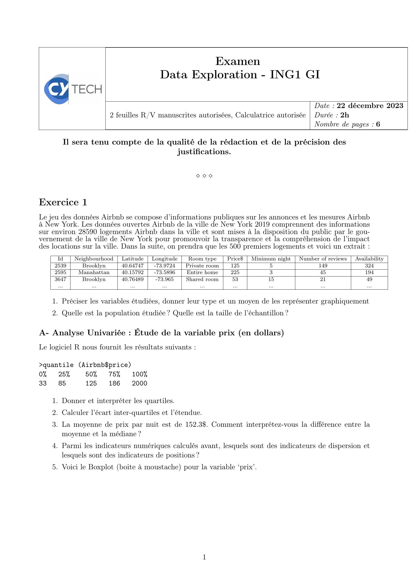 Page 1 : ExamenData Exploration - ING1 GIDate : 22 décembre 20232 feuilles R/V manuscrites autorisées, Calculatrice autoriséeDurée : 2hNombre de pages : 6Il sera tenu compte de la qualité de la rédaction et de la précision desjustifications.Exercice 1Le jeu des données Airbnb se compose d’informations publiques sur les annonces et les mesures Airbnbà New York. Les données ouvertes Airbnb de la ville de New York 2019 comprennent des informationssur environ 28590 logements Airbnb dans la ville et sont mises à la disposition du public par le gou-vernement de la ville de New York pour promouvoir la transparence et la compréhension de l’impactdes locations sur la ville. Dans la suite, on prendra que les 500 premiers logements et voici un extrait :IdNeighbourhoodLatitudeLongitudeRoom typePriceMinimum nightNumber of reviewsAvailability2539Brooklyn40.64747-73.9724Private room12551493242595Manahattan40.15792-73.5896Entire home2253451943647Brooklyn40.76489-73.965Shared room53152149...........................1. Préciser les variables étudiées, donner leur type et un moyen de les représenter graphiquement2. Quelle est la population étudiée ? Quelle est la taille de l’échantillon ?A- Analyse Univariée : Étude de la variable prix en dollarsLe logiciel R nous fournit les résultats suivants :quantile Airbnbprice0255075100338512518620001. Donner et interpréter les quartiles.2. Calculer l’écart inter-quartiles et l’étendue.3. La moyenne de prix par nuit est de 152.3. Comment interprétez-vous la différence entre lamoyenne et la médiane ?4. Parmi les indicateurs numériques calculés avant, lesquels sont des indicateurs de dispersion etlesquels sont des indicateurs de positions ?5. Voici le Boxplot boite à moustache pour la variable ‘prix’.1