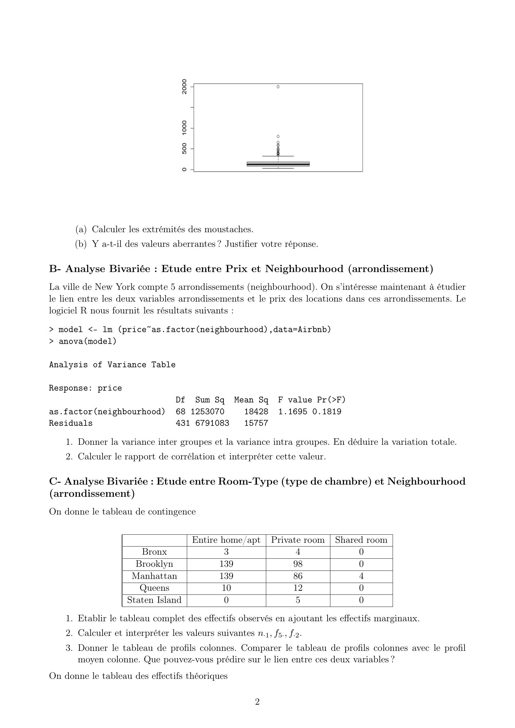 Page 2 : a Calculer les extrémités des moustaches.b Y a-t-il des valeurs aberrantes ? Justifier votre réponse.B- Analyse Bivariée : Etude entre Prix et Neighbourhood arrondissementLa ville de New York compte 5 arrondissements neighbourhood. On s’intéresse maintenant à étudierle lien entre les deux variables arrondissements et le prix des locations dans ces arrondissements. Lelogiciel R nous fournit les résultats suivants : model - lm priceas.factorneighbourhood,data=Airbnb anovamodelAnalysis of Variance TableResponse: priceDfSum SqMean SqF value PrFas.factorneighbourhood68 1253070184281.1695 0.1819Residuals431 6791083157571. Donner la variance inter groupes et la variance intra groupes. En déduire la variation totale.2. Calculer le rapport de corrélation et interpréter cette valeur.C- Analyse Bivariée : Etude entre Room-Type type de chambre et NeighbourhoodarrondissementOn donne le tableau de contingenceEntire home/aptPrivate roomShared roomBronx340Brooklyn139980Manhattan139864Queens10120Staten Island0501. Etablir le tableau complet des effectifs observés en ajoutant les effectifs marginaux.2. Calculer et interpréter les valeurs suivantes n·1, f5·, f·2.3. Donner le tableau de profils colonnes. Comparer le tableau de profils colonnes avec le profilmoyen colonne. Que pouvez-vous prédire sur le lien entre ces deux variables ?On donne le tableau des effectifs théoriques2