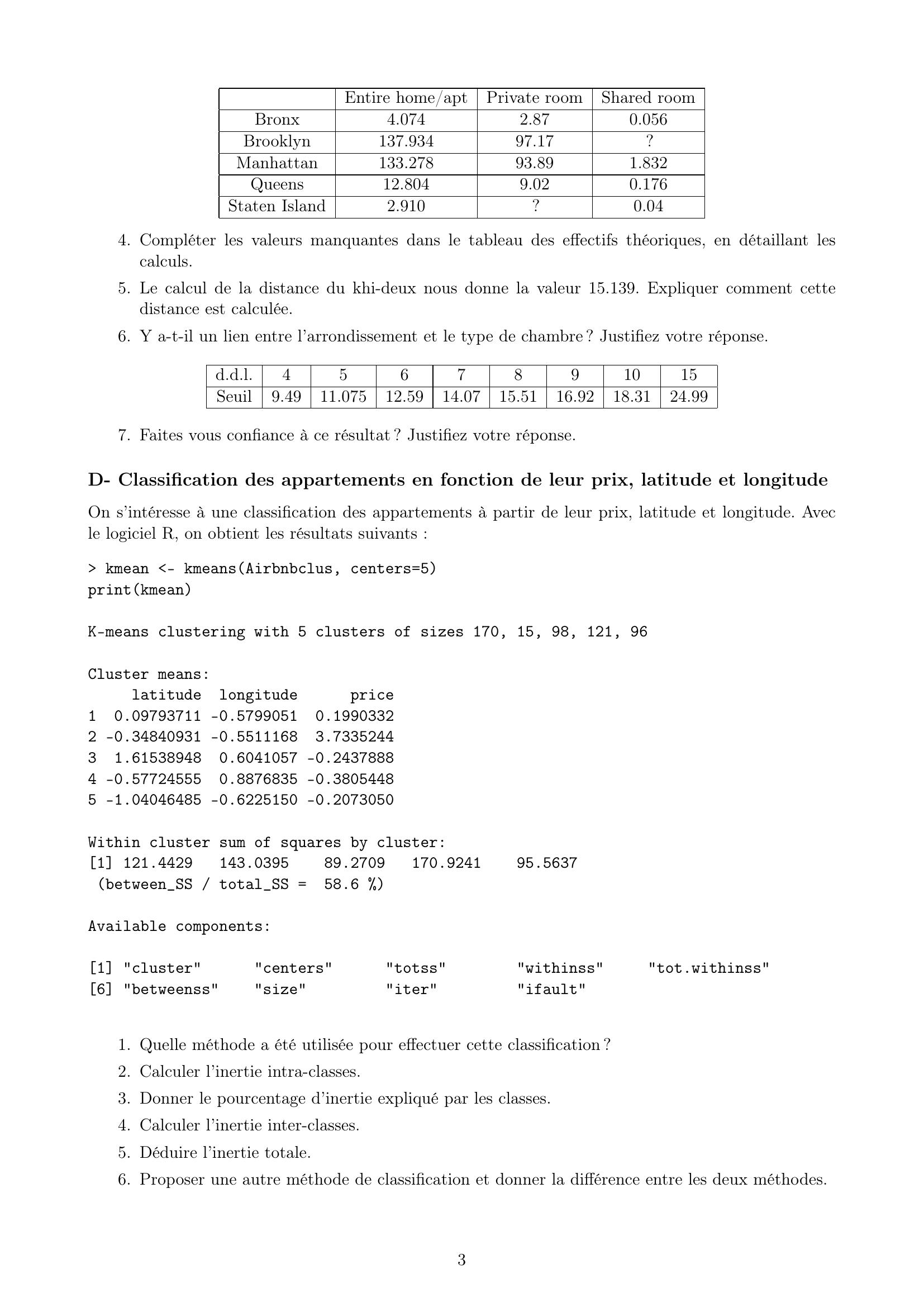 Page 3 : Entire home/aptPrivate roomShared roomBronx4.0742.870.056Brooklyn137.93497.17?Manhattan133.27893.891.832Queens12.8049.020.176Staten Island2.910?0.044. Compléter les valeurs manquantes dans le tableau des effectifs théoriques, en détaillant lescalculs.5. Le calcul de la distance du khi-deux nous donne la valeur 15.139. Expliquer comment cettedistance est calculée.6. Y a-t-il un lien entre l’arrondissement et le type de chambre ? Justifiez votre réponse.d.d.l.4567891015Seuil9.4911.07512.5914.0715.5116.9218.3124.997. Faites vous confiance à ce résultat ? Justifiez votre réponse.D- Classification des appartements en fonction de leur prix, latitude et longitudeOn s’intéresse à une classification des appartements à partir de leur prix, latitude et longitude. Avecle logiciel R, on obtient les résultats suivants : kmean - kmeansAirbnbclus, centers=5printkmeanK-means clustering with 5 clusters of sizes 170, 15, 98, 121, 96Cluster means:latitudelongitudeprice10.09793711 -0.57990510.19903322 -0.34840931 -0.55111683.733524431.615389480.6041057 -0.24378884 -0.577245550.8876835 -0.38054485 -1.04046485 -0.6225150 -0.2073050Within cluster sum of squares by cluster:1 121.4429143.039589.2709170.924195.5637betweenSS / totalSS =58.6 Available components:1 "cluster""centers""totss""withinss""tot.withinss"6 "betweenss""size""iter""ifault"1. Quelle méthode a été utilisée pour effectuer cette classification ?2. Calculer l’inertie intra-classes.3. Donner le pourcentage d’inertie expliqué par les classes.4. Calculer l’inertie inter-classes.5. Déduire l’inertie totale.6. Proposer une autre méthode de classification et donner la différence entre les deux méthodes.3