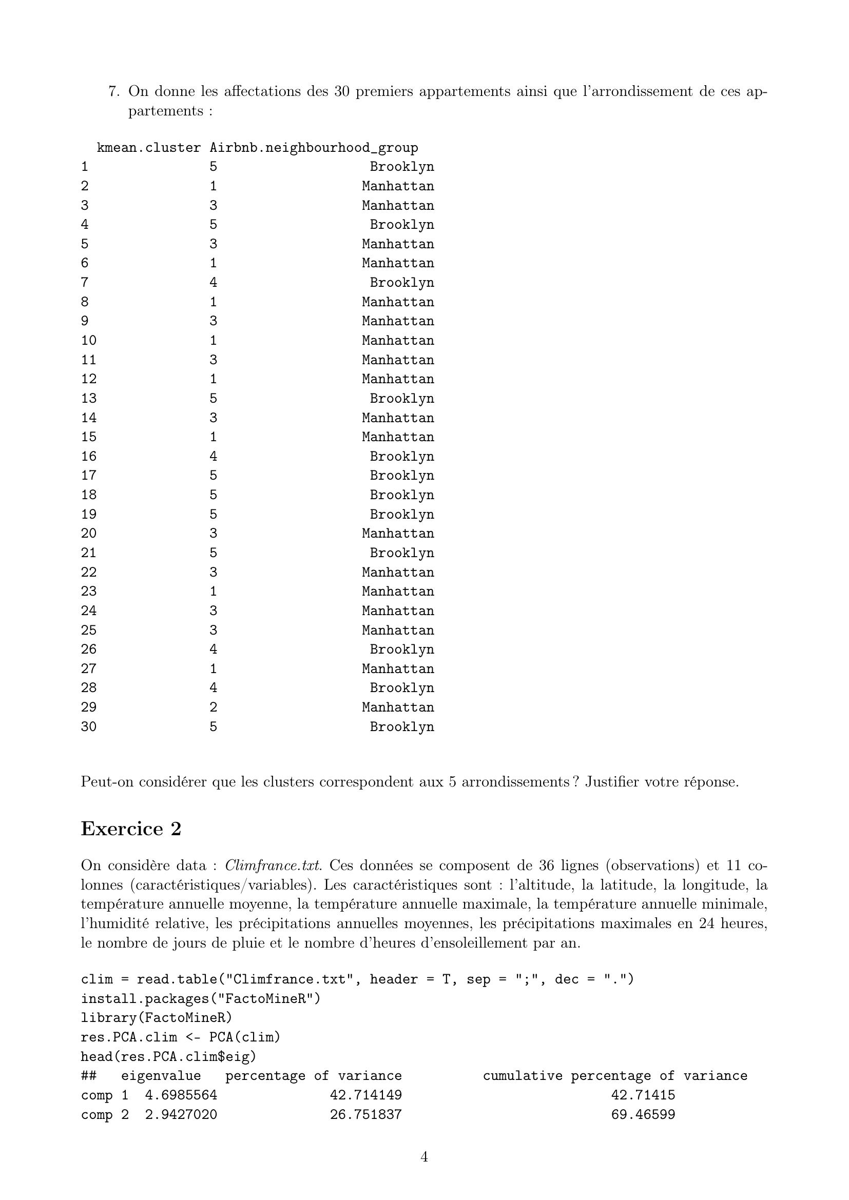 Page 4 : 7. On donne les affectations des 30 premiers appartements ainsi que l’arrondissement de ces ap-partements :kmean.cluster Airbnb.neighbourhoodgroup15Brooklyn21Manhattan33Manhattan45Brooklyn53Manhattan61Manhattan74Brooklyn81Manhattan93Manhattan101Manhattan113Manhattan121Manhattan135Brooklyn143Manhattan151Manhattan164Brooklyn175Brooklyn185Brooklyn195Brooklyn203Manhattan215Brooklyn223Manhattan231Manhattan243Manhattan253Manhattan264Brooklyn271Manhattan284Brooklyn292Manhattan305BrooklynPeut-on considérer que les clusters correspondent aux 5 arrondissements ? Justifier votre réponse.Exercice 2On considère data : Climfrance.txt. Ces données se composent de 36 lignes observations et 11 co-lonnes caractéristiques/variables. Les caractéristiques sont : l’altitude, la latitude, la longitude, latempérature annuelle moyenne, la température annuelle maximale, la température annuelle minimale,l’humidité relative, les précipitations annuelles moyennes, les précipitations maximales en 24 heures,le nombre de jours de pluie et le nombre d’heures d’ensoleillement par an.clim = read.table"Climfrance.txt", header = T, sep = ";", dec = "."install.packages"FactoMineR"libraryFactoMineRres.PCA.clim - PCAclimheadres.PCA.climeigeigenvaluepercentage of variancecumulative percentage of variancecomp 14.698556442.71414942.71415comp 22.942702026.75183769.465994