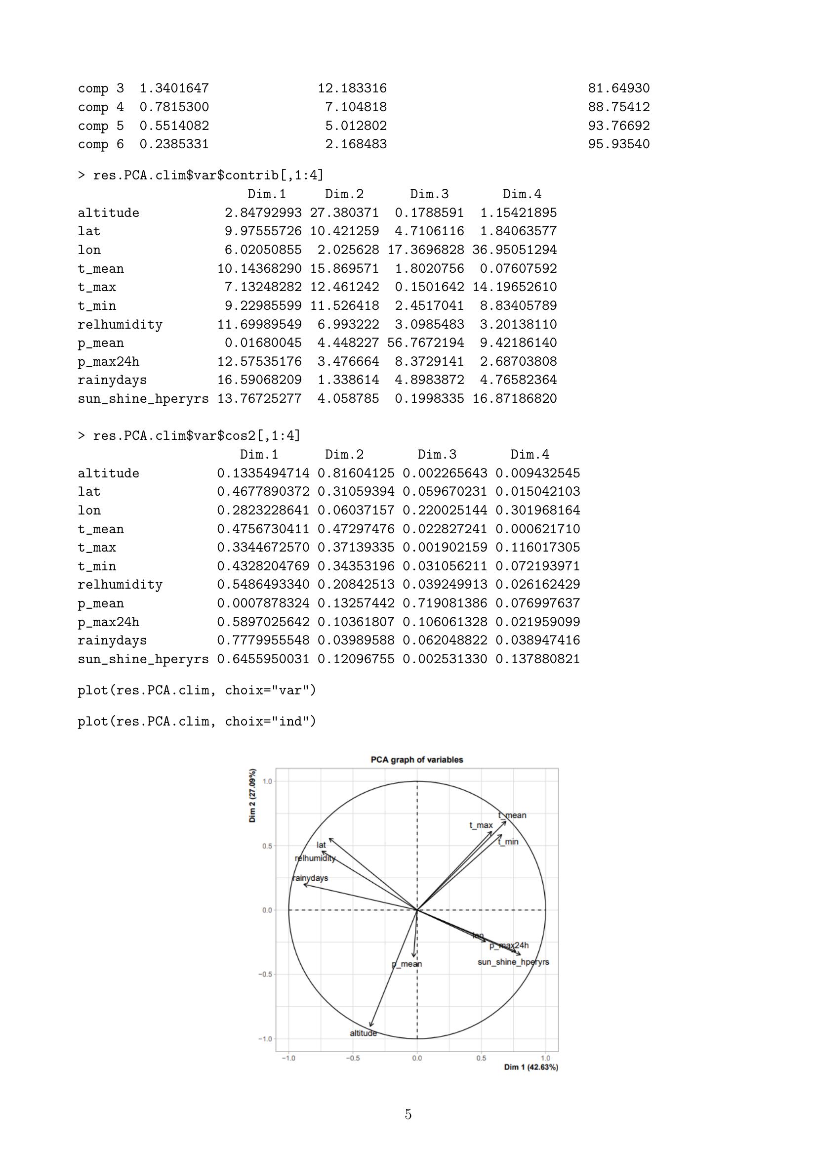 Page 5 : comp 31.340164712.18331681.64930comp 40.78153007.10481888.75412comp 50.55140825.01280293.76692comp 60.23853312.16848395.93540 res.PCA.climvarcontrib,1:4Dim.1Dim.2Dim.3Dim.4altitude2.84792993 27.3803710.17885911.15421895lat9.97555726 10.4212594.71061161.84063577lon6.020508552.025628 17.3696828 36.95051294tmean10.14368290 15.8695711.80207560.07607592tmax7.13248282 12.4612420.1501642 14.19652610tmin9.22985599 11.5264182.45170418.83405789relhumidity11.699895496.9932223.09854833.20138110pmean0.016800454.448227 56.76721949.42186140pmax24h12.575351763.4766648.37291412.68703808rainydays16.590682091.3386144.89838724.76582364sunshinehperyrs 13.767252774.0587850.1998335 16.87186820 res.PCA.climvarcos2,1:4Dim.1Dim.2Dim.3Dim.4altitude0.1335494714 0.81604125 0.002265643 0.009432545lat0.4677890372 0.31059394 0.059670231 0.015042103lon0.2823228641 0.06037157 0.220025144 0.301968164tmean0.4756730411 0.47297476 0.022827241 0.000621710tmax0.3344672570 0.37139335 0.001902159 0.116017305tmin0.4328204769 0.34353196 0.031056211 0.072193971relhumidity0.5486493340 0.20842513 0.039249913 0.026162429pmean0.0007878324 0.13257442 0.719081386 0.076997637pmax24h0.5897025642 0.10361807 0.106061328 0.021959099rainydays0.7779955548 0.03989588 0.062048822 0.038947416sunshinehperyrs 0.6455950031 0.12096755 0.002531330 0.137880821plotres.PCA.clim, choix="var"plotres.PCA.clim, choix="ind"5