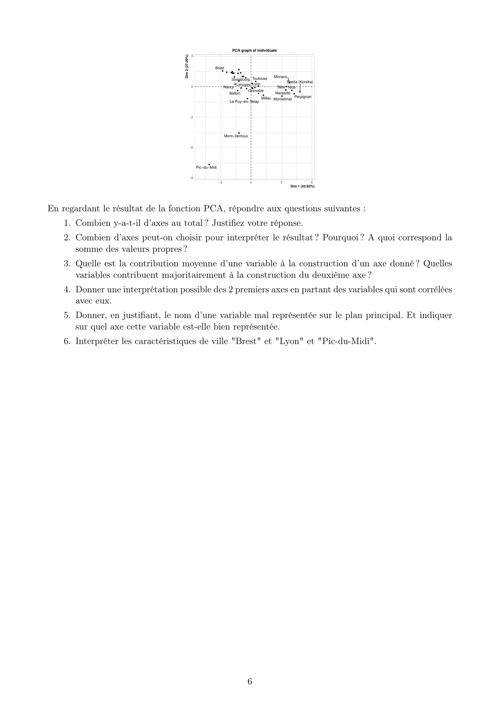 Page 6 : MarseilleNiceBastia KorsikaPerpignanMonacoMontelimarSèteBrestStrasbourg ToulouseLyonNancyGrenobleLimogesMillauBelfortLe PuyenVelayMontVentouxPicduMidi963033036Dim 1 42.63Dim 2 27.09PCA graph of individualsEn regardant le résultat de la fonction PCA, répondre aux questions suivantes :1. Combien y-a-t-il d’axes au total ? Justifiez votre réponse.2. Combien d’axes peut-on choisir pour interpréter le résultat ? Pourquoi ? A quoi correspond lasomme des valeurs propres ?3. Quelle est la contribution moyenne d’une variable à la construction d’un axe donné ? Quellesvariables contribuent majoritairement à la construction du deuxième axe ?4. Donner une interprétation possible des 2 premiers axes en partant des variables qui sont corréléesavec eux.5. Donner, en justifiant, le nom d’une variable mal représentée sur le plan principal. Et indiquersur quel axe cette variable est-elle bien représentée.6. Interpréter les caractéristiques de ville "Brest" et "Lyon" et "Pic-du-Midi".6
