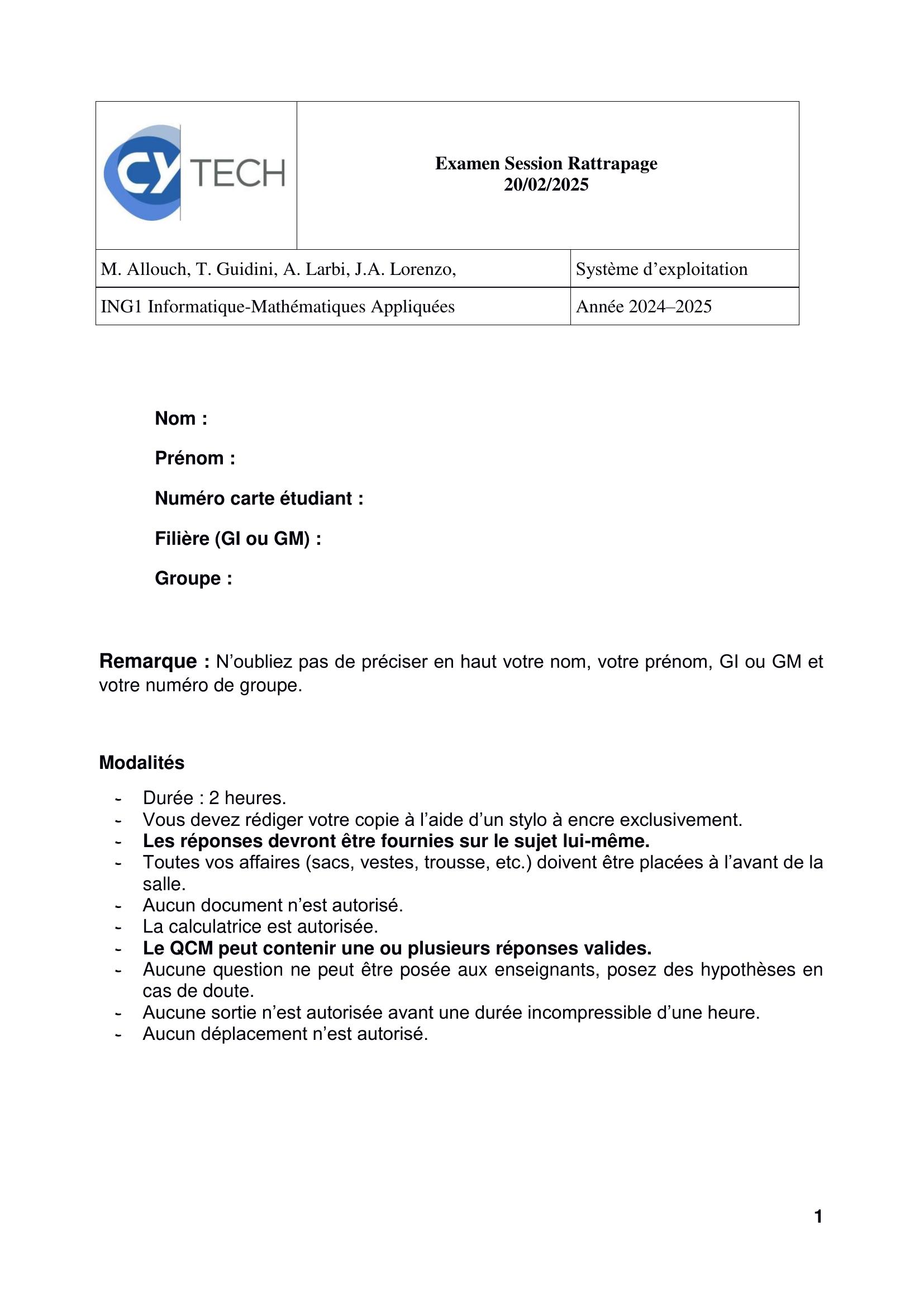 Page 1 : 1 Examen Session Rattrapage 20/02/2025 M. Allouch, T. Guidini, A. Larbi, J.A. Lorenzo, Système d’exploitation ING1 Informatique-Mathématiques Appliquées Année 2024–2025 Nom : Prénom : Numéro carte étudiant : Filière GI ou GM : Groupe : Remarque : N’oubliez pas de préciser en haut votre nom, votre prénom, GI ou GM et votre numéro de groupe. Modalités ֊ Durée : 2 heures. ֊ Vous devez rédiger votre copie à l’aide d’un stylo à encre exclusivement. ֊ Les réponses devront être fournies sur le sujet lui-même. ֊ Toutes vos affaires sacs, vestes, trousse, etc. doivent être placées à l’avant de la salle. ֊ Aucun document n’est autorisé. ֊ La calculatrice est autorisée. ֊ Le QCM peut contenir une ou plusieurs réponses valides. ֊ Aucune question ne peut être posée aux enseignants, posez des hypothèses en cas de doute. ֊ Aucune sortie n’est autorisée avant une durée incompressible d’une heure. ֊ Aucun déplacement n’est autorisé.