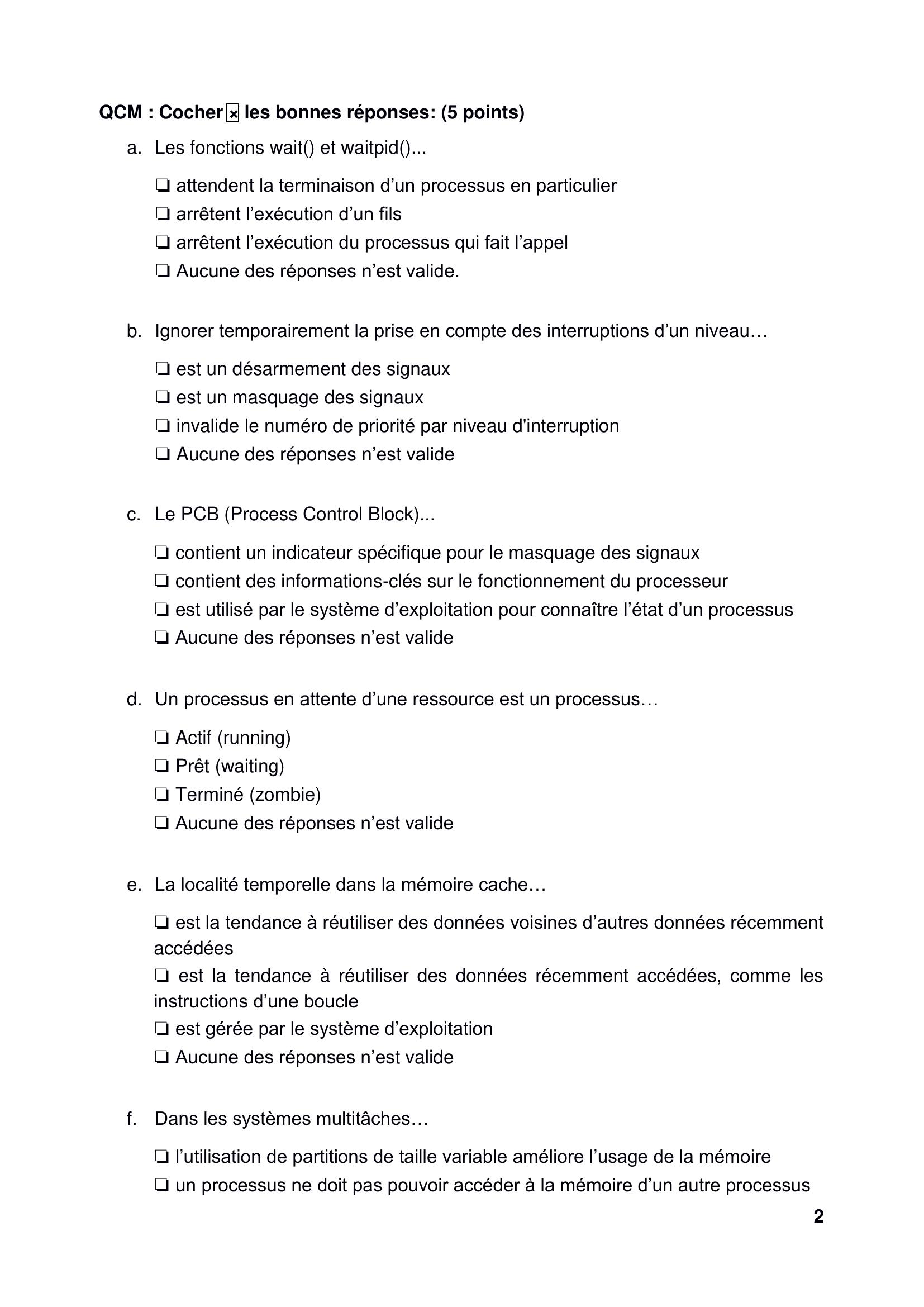 Page 2 : 2 QCM : Cocher × les bonnes réponses: 5 points a. Les fonctions wait et waitpid... ❏ attendent la terminaison d’un processus en particulier ❏ arrêtent l’exécution d’un fils ❏ arrêtent l’exécution du processus qui fait l’appel ❏ Aucune des réponses n’est valide. b. Ignorer temporairement la prise en compte des interruptions d’un niveau… ❏ est un désarmement des signaux ❏ est un masquage des signaux ❏ invalide le numéro de priorité par niveau d'interruption ❏ Aucune des réponses n’est valide c. Le PCB Process Control Block... ❏ contient un indicateur spécifique pour le masquage des signaux ❏ contient des informations-clés sur le fonctionnement du processeur ❏ est utilisé par le système d’exploitation pour connaître l’état d’un processus ❏ Aucune des réponses n’est valide d. Un processus en attente d’une ressource est un processus… ❏ Actif running ❏ Prêt waiting ❏ Terminé zombie ❏ Aucune des réponses n’est valide e. La localité temporelle dans la mémoire cache… ❏ est la tendance à réutiliser des données voisines d’autres données récemment accédées ❏ est la tendance à réutiliser des données récemment accédées, comme les instructions d’une boucle ❏ est gérée par le système d’exploitation ❏ Aucune des réponses n’est valide f. Dans les systèmes multitâches… ❏ l’utilisation de partitions de taille variable améliore l’usage de la mémoire ❏ un processus ne doit pas pouvoir accéder à la mémoire d’un autre processus