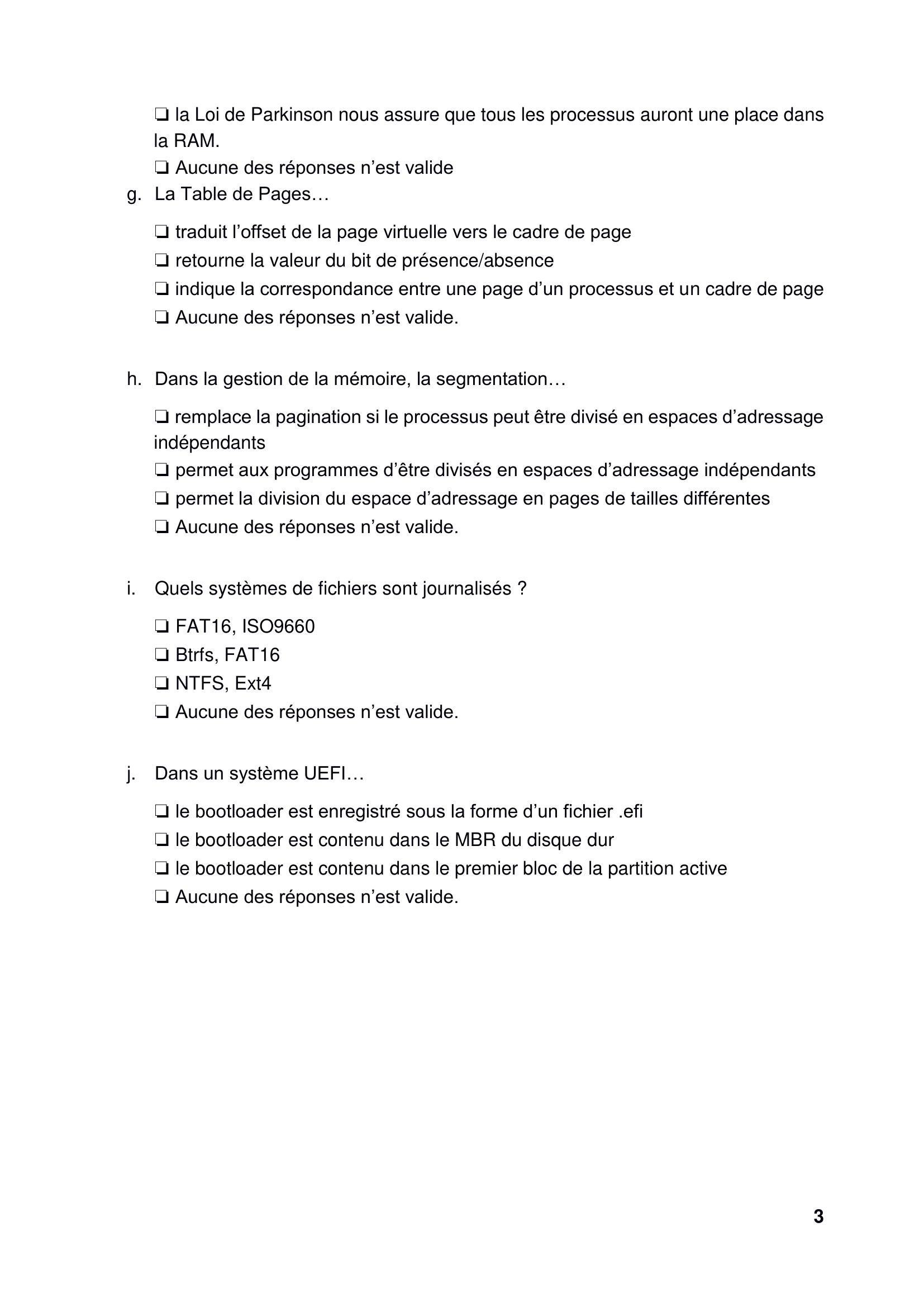 Page 3 : 3 ❏ la Loi de Parkinson nous assure que tous les processus auront une place dans la RAM. ❏ Aucune des réponses n’est valide g. La Table de Pages… ❏ traduit l’offset de la page virtuelle vers le cadre de page ❏ retourne la valeur du bit de présence/absence ❏ indique la correspondance entre une page d’un processus et un cadre de page ❏ Aucune des réponses n’est valide. h. Dans la gestion de la mémoire, la segmentation… ❏ remplace la pagination si le processus peut être divisé en espaces d’adressage indépendants ❏ permet aux programmes d’être divisés en espaces d’adressage indépendants ❏ permet la division du espace d’adressage en pages de tailles différentes ❏ Aucune des réponses n’est valide. i. Quels systèmes de fichiers sont journalisés ? ❏ FAT16, ISO9660 ❏ Btrfs, FAT16 ❏ NTFS, Ext4 ❏ Aucune des réponses n’est valide. j. Dans un système UEFI… ❏ le bootloader est enregistré sous la forme d’un fichier .efi ❏ le bootloader est contenu dans le MBR du disque dur ❏ le bootloader est contenu dans le premier bloc de la partition active ❏ Aucune des réponses n’est valide.