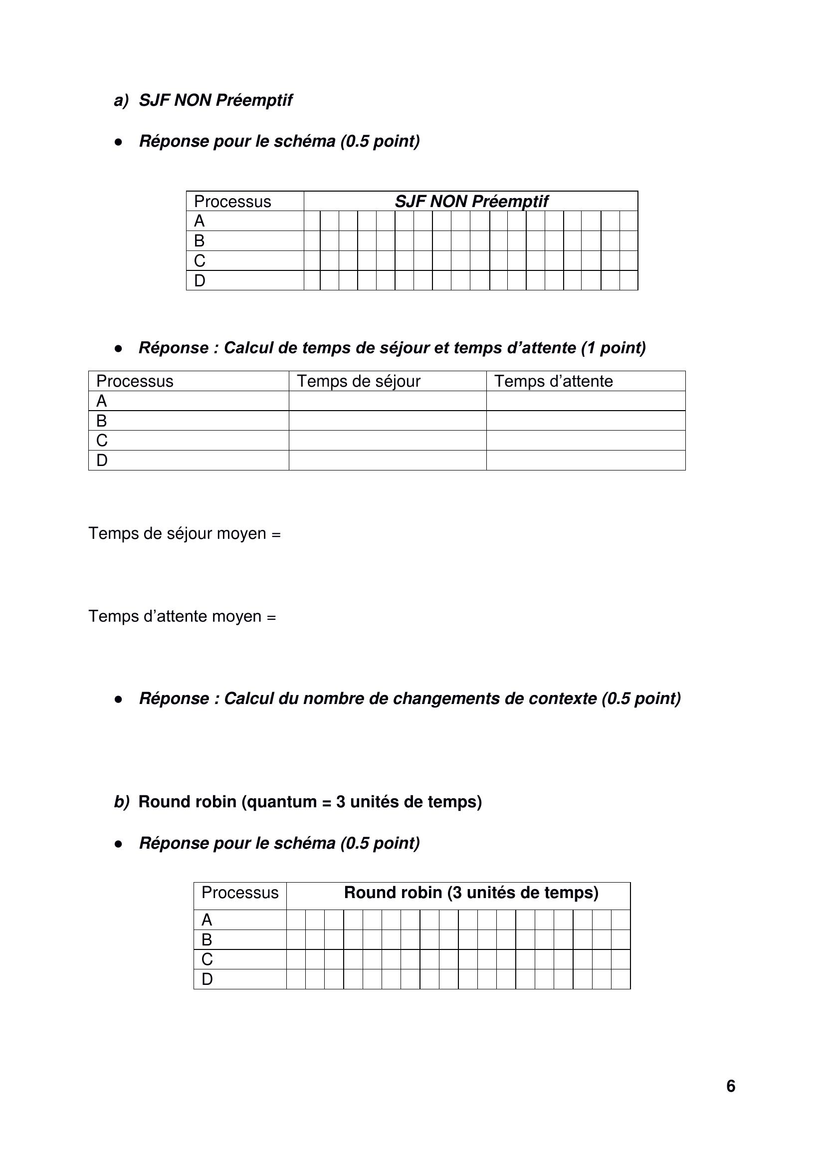 Page 6 : 6 a SJF NON Préemptif ● Réponse pour le schéma 0.5 point ● Réponse : Calcul de temps de séjour et temps d’attente 1 point Temps de séjour moyen = Temps d’attente moyen = ● Réponse : Calcul du nombre de changements de contexte 0.5 point b Round robin quantum = 3 unités de temps ● Réponse pour le schéma 0.5 point Processus SJF NON Préemptif A B C D Processus Temps de séjour Temps d’attente A B C D Processus Round robin 3 unités de temps A B C D