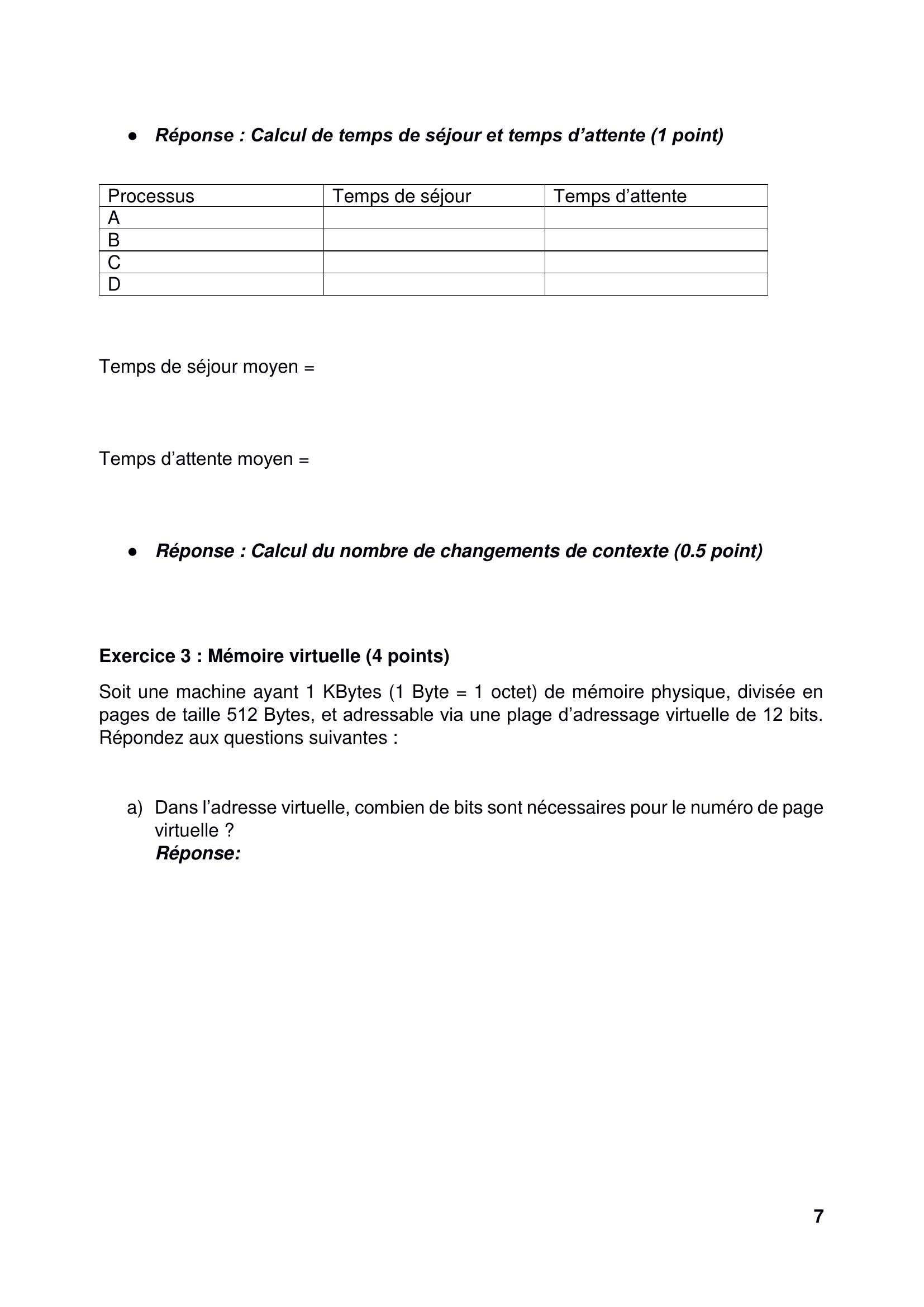 Page 7 : 7 ● Réponse : Calcul de temps de séjour et temps d’attente 1 point Temps de séjour moyen = Temps d’attente moyen = ● Réponse : Calcul du nombre de changements de contexte 0.5 point Exercice 3 : Mémoire virtuelle 4 points Soit une machine ayant 1 KBytes 1 Byte = 1 octet de mémoire physique, divisée en pages de taille 512 Bytes, et adressable via une plage d’adressage virtuelle de 12 bits. Répondez aux questions suivantes : a Dans l’adresse virtuelle, combien de bits sont nécessaires pour le numéro de page virtuelle ? Réponse: Processus Temps de séjour Temps d’attente A B C D