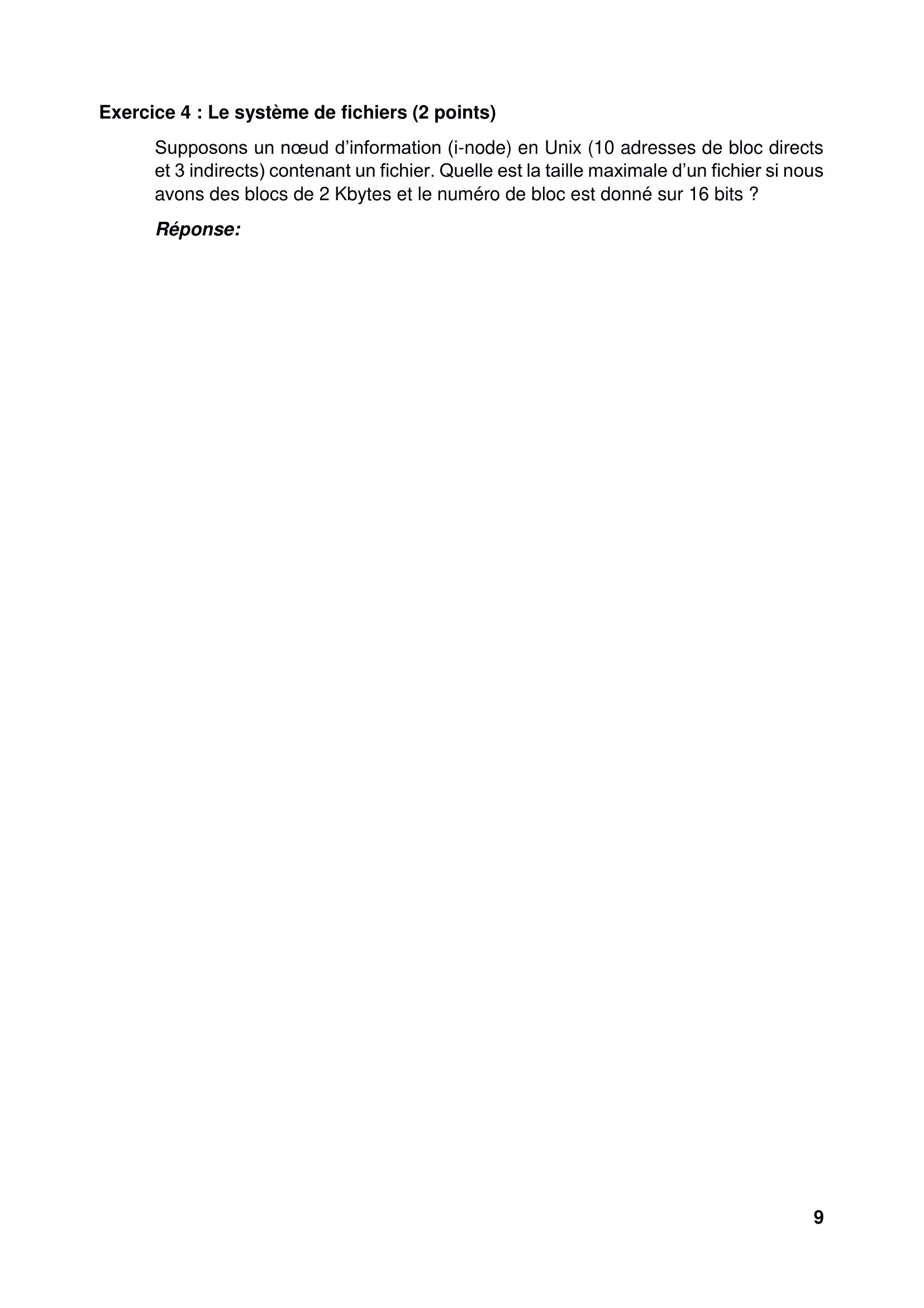 Page 9 : 9 Exercice 4 : Le système de fichiers 2 points Supposons un nœud d’information i-node en Unix 10 adresses de bloc directs et 3 indirects contenant un fichier. Quelle est la taille maximale d’un fichier si nous avons des blocs de 2 Kbytes et le numéro de bloc est donné sur 16 bits ? Réponse: