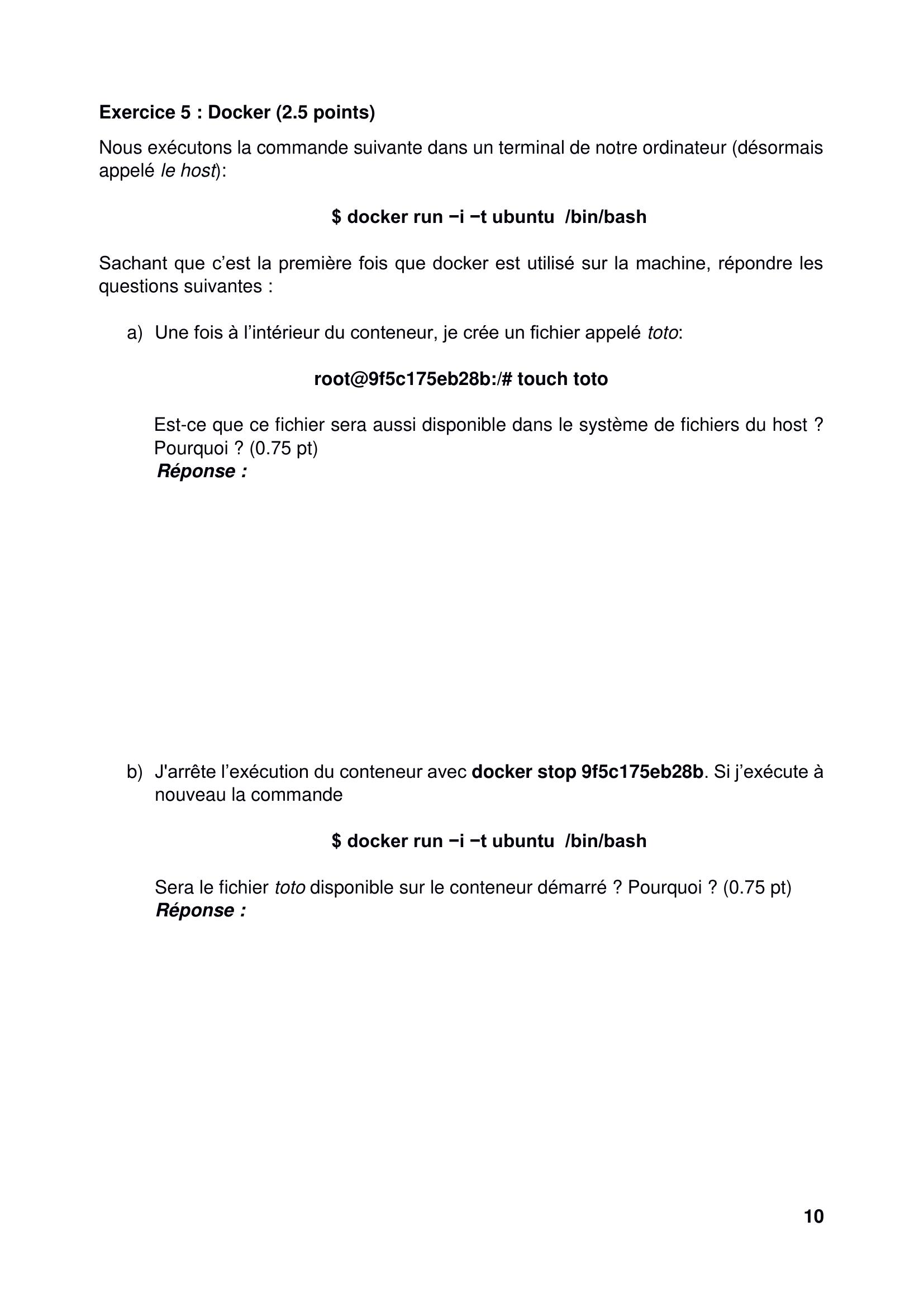 Page 10 : 10 Exercice 5 : Docker 2.5 points Nous exécutons la commande suivante dans un terminal de notre ordinateur désormais appelé le host: docker run i t ubuntu /bin/bash Sachant que c’est la première fois que docker est utilisé sur la machine, répondre les questions suivantes : a Une fois à l’intérieur du conteneur, je crée un fichier appelé toto: root@9f5c175eb28b:/ touch toto Est-ce que ce fichier sera aussi disponible dans le système de fichiers du host ? Pourquoi ? 0.75 pt Réponse : b J'arrête l’exécution du conteneur avec docker stop 9f5c175eb28b. Si j’exécute à nouveau la commande docker run i t ubuntu /bin/bash Sera le fichier toto disponible sur le conteneur démarré ? Pourquoi ? 0.75 pt Réponse :