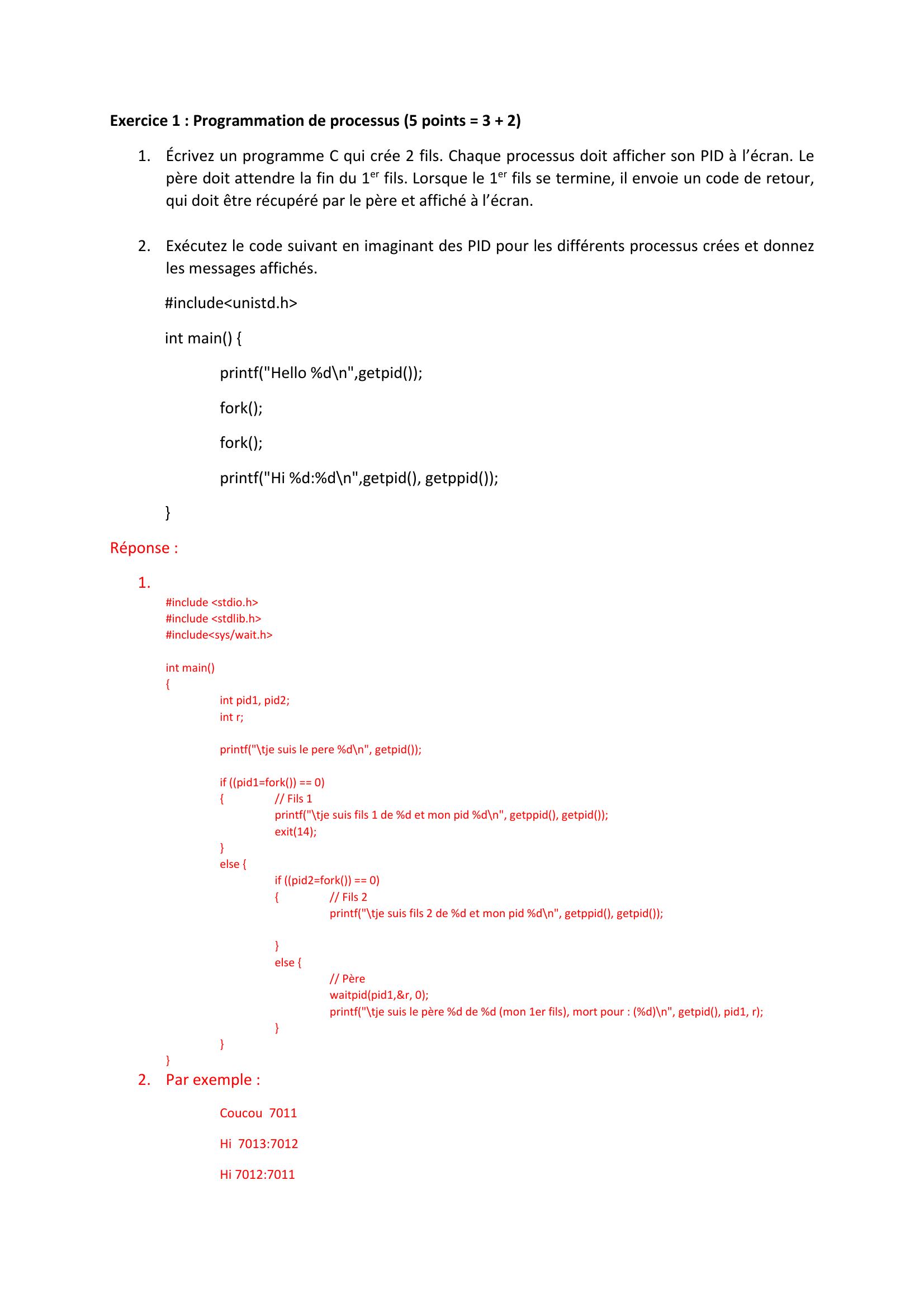 Page 2 : Exercice 1 : Programmation de processus 5 points = 3 + 2 1. Écrivez un programme C qui crée 2 fils. Chaque processus doit afficher son PID à l’écran. Le père doit attendre la fin du 1er fils. Lorsque le 1er fils se termine, il envoie un code de retour, qui doit être récupéré par le père et affiché à l’écran. 2. Exécutez le code suivant en imaginant des PID pour les différents processus crées et donnez les messages affichés. includeunistd.h int main printf"Hello d\n",getpid; fork; fork; printf"Hi d:d\n",getpid, getppid; Réponse : 1. include stdio.h include stdlib.h includesys/wait.h int main int pid1, pid2; int r; printf"\tje suis le pere d\n", getpid; if pid1=fork == 0 // Fils 1 printf"\tje suis fils 1 de d et mon pid d\n", getppid, getpid; exit14; else if pid2=fork == 0 // Fils 2 printf"\tje suis fils 2 de d et mon pid d\n", getppid, getpid; else // Père waitpidpid1,&r, 0; printf"\tje suis le père d de d mon 1er fils, mort pour : d\n", getpid, pid1, r; 2. Par exemple : Coucou 7011 Hi 7013:7012 Hi 7012:7011