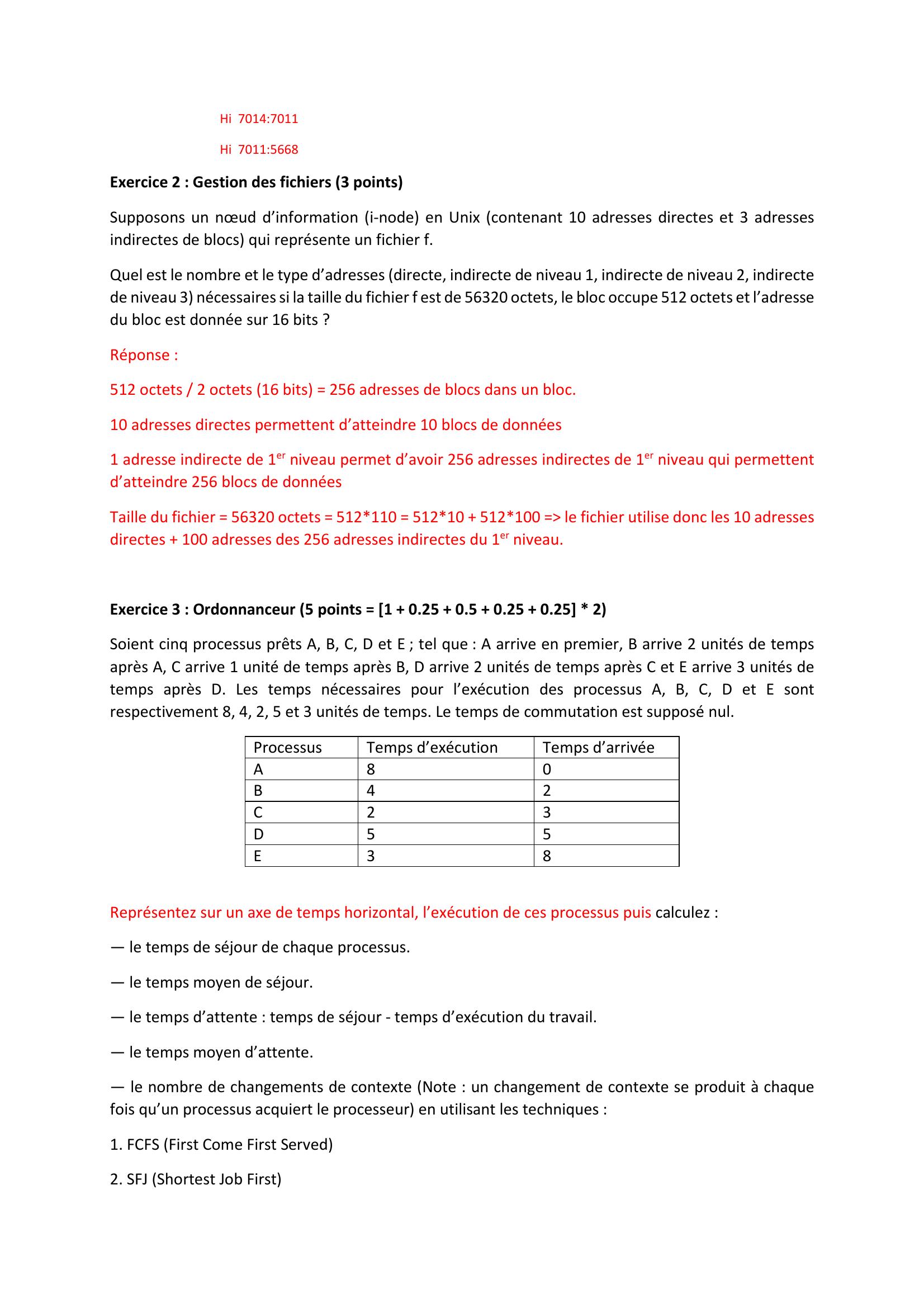 Page 3 : Hi 7014:7011 Hi 7011:5668 Exercice 2 : Gestion des fichiers 3 points Supposons un nœud d’information i-node en Unix contenant 10 adresses directes et 3 adresses indirectes de blocs qui représente un fichier f. Quel est le nombre et le type d’adresses directe, indirecte de niveau 1, indirecte de niveau 2, indirecte de niveau 3 nécessaires si la taille du fichier f est de 56320 octets, le bloc occupe 512 octets et l’adresse du bloc est donnée sur 16 bits ? Réponse : 512 octets / 2 octets 16 bits = 256 adresses de blocs dans un bloc. 10 adresses directes permettent d’atteindre 10 blocs de données 1 adresse indirecte de 1er niveau permet d’avoir 256 adresses indirectes de 1er niveau qui permettent d’atteindre 256 blocs de données Taille du fichier = 56320 octets = 512110 = 51210 + 512100 = le fichier utilise donc les 10 adresses directes + 100 adresses des 256 adresses indirectes du 1er niveau. Exercice 3 : Ordonnanceur 5 points = 1 + 0.25 + 0.5 + 0.25 + 0.25 2 Soient cinq processus prêts A, B, C, D et E ; tel que : A arrive en premier, B arrive 2 unités de temps après A, C arrive 1 unité de temps après B, D arrive 2 unités de temps après C et E arrive 3 unités de temps après D. Les temps nécessaires pour l’exécution des processus A, B, C, D et E sont respectivement 8, 4, 2, 5 et 3 unités de temps. Le temps de commutation est supposé nul. ProcessusTemps d’exécutionTemps d’arrivéeA80B42C23D55E38 Représentez sur un axe de temps horizontal, l’exécution de ces processus puis calculez : — le temps de séjour de chaque processus. — le temps moyen de séjour. — le temps d’attente : temps de séjour - temps d’exécution du travail. — le temps moyen d’attente. — le nombre de changements de contexte Note : un changement de contexte se produit à chaque fois qu’un processus acquiert le processeur en utilisant les techniques : 1. FCFS First Come First Served 2. SFJ Shortest Job First