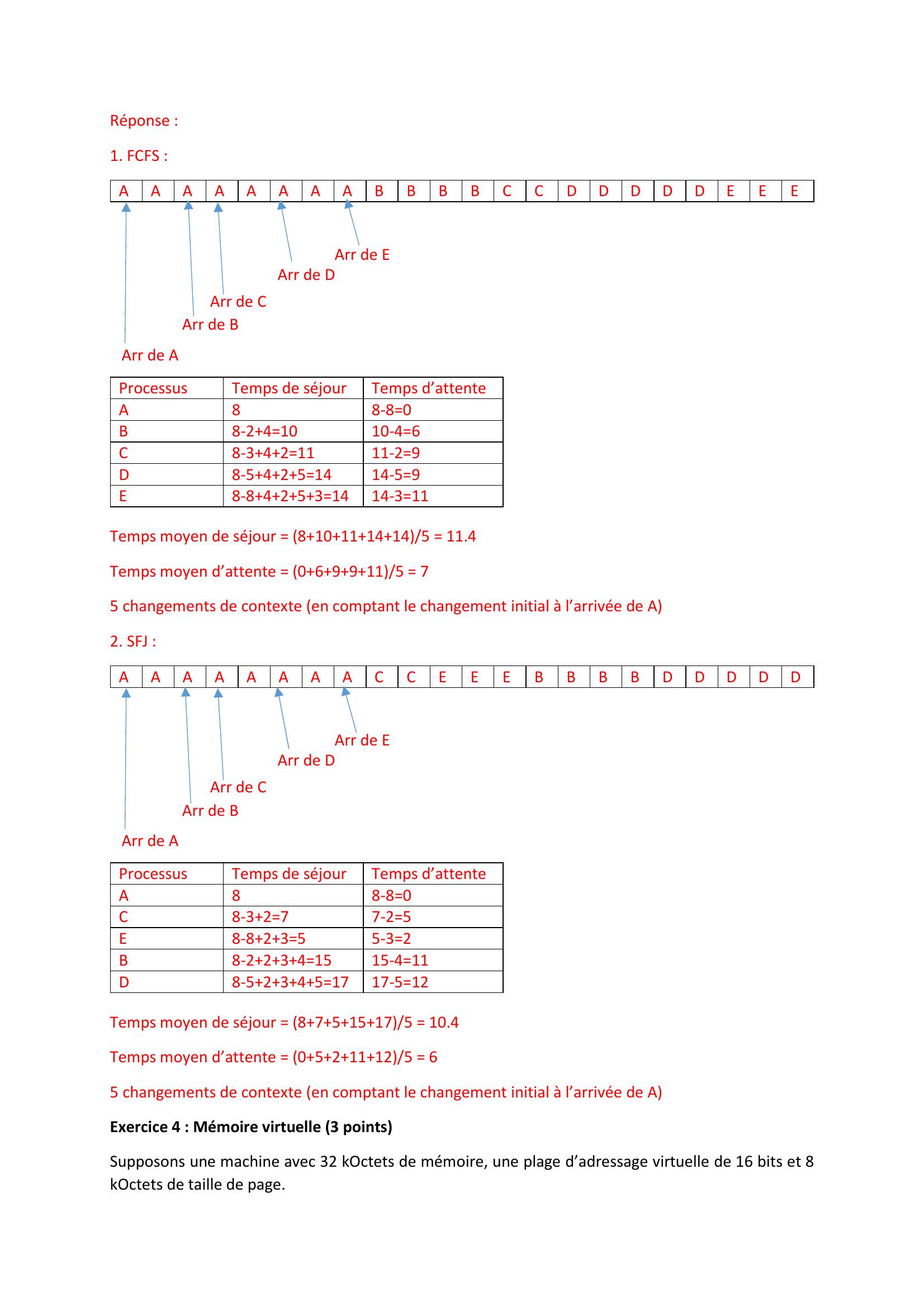 Page 4 : Réponse : 1. FCFS : AAAAAAAABBBBCCDDDDDEEE ProcessusTemps de séjourTemps d’attenteA88-8=0B8-2+4=1010-4=6C8-3+4+2=1111-2=9D8-5+4+2+5=1414-5=9E8-8+4+2+5+3=1414-3=11Temps moyen de séjour = 8+10+11+14+14/5 = 11.4 Temps moyen d’attente = 0+6+9+9+11/5 = 7 5 changements de contexte en comptant le changement initial à l’arrivée de A 2. SFJ : AAAAAAAACCEEEBBBBDDDDD ProcessusTemps de séjourTemps d’attenteA88-8=0C8-3+2=77-2=5E8-8+2+3=55-3=2B8-2+2+3+4=1515-4=11D8-5+2+3+4+5=1717-5=12Temps moyen de séjour = 8+7+5+15+17/5 = 10.4 Temps moyen d’attente = 0+5+2+11+12/5 = 6 5 changements de contexte en comptant le changement initial à l’arrivée de A Exercice 4 : Mémoire virtuelle 3 points Supposons une machine avec 32 kOctets de mémoire, une plage d’adressage virtuelle de 16 bits et 8 kOctets de taille de page. Arr de AArr de BArr de CArr de DArr de EArr de AArr de BArr de CArr de DArr de E