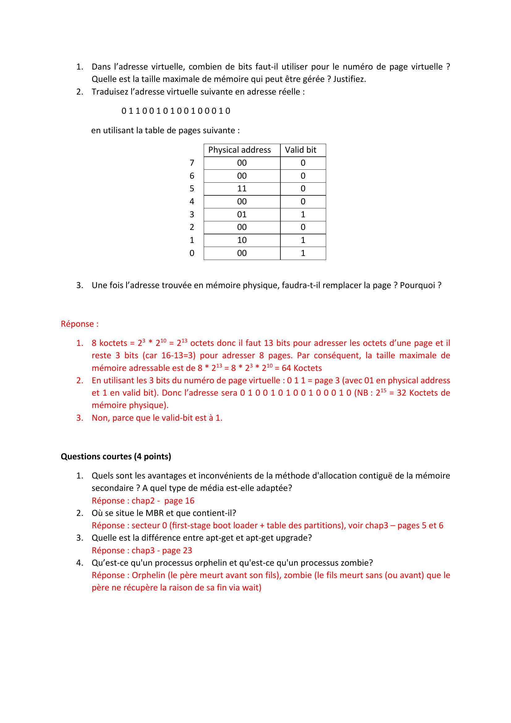 Page 5 : 1. Dans l’adresse virtuelle, combien de bits faut-il utiliser pour le numéro de page virtuelle ? Quelle est la taille maximale de mémoire qui peut être gérée ? Justifiez. 2. Traduisez l’adresse virtuelle suivante en adresse réelle : 0 1 1 0 0 1 0 1 0 0 1 0 0 0 1 0 en utilisant la table de pages suivante : Physical addressValid bit70006000511040003011200011010001 3. Une fois l’adresse trouvée en mémoire physique, faudra-t-il remplacer la page ? Pourquoi ? Réponse : 1. 8 koctets = 23 210 = 213 octets donc il faut 13 bits pour adresser les octets d’une page et il reste 3 bits car 16-13=3 pour adresser 8 pages. Par conséquent, la taille maximale de mémoire adressable est de 8 213 = 8 23 210 = 64 Koctets 2. En utilisant les 3 bits du numéro de page virtuelle : 0 1 1 = page 3 avec 01 en physical address et 1 en valid bit. Donc l’adresse sera 0 1 0 0 1 0 1 0 0 1 0 0 0 1 0 NB : 215 = 32 Koctets de mémoire physique. 3. Non, parce que le valid-bit est à 1. Questions courtes 4 points 1. Quels sont les avantages et inconvénients de la méthode d'allocation contiguë de la mémoire secondaire ? A quel type de média est-elle adaptée? Réponse : chap2 - page 16 2. Où se situe le MBR et que contient-il? Réponse : secteur 0 first-stage boot loader + table des partitions, voir chap3 – pages 5 et 6 3. Quelle est la différence entre apt-get et apt-get upgrade? Réponse : chap3 - page 23 4. Qu’est-ce qu'un processus orphelin et qu'est-ce qu'un processus zombie? Réponse : Orphelin le père meurt avant son fils, zombie le fils meurt sans ou avant que le père ne récupère la raison de sa fin via wait