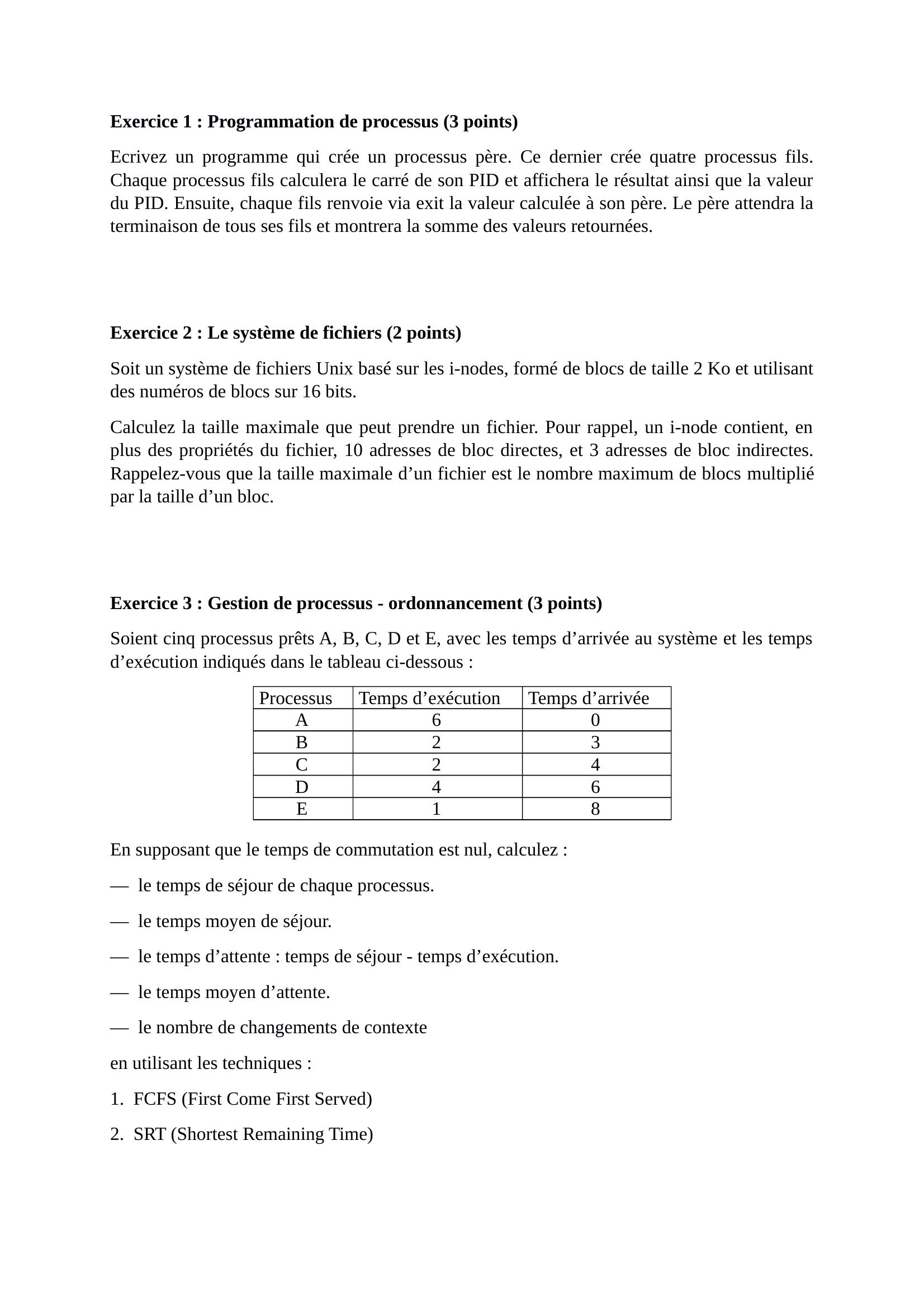 Page 2 : Exercice 1 : Programmation de processus 3 pointsEcrivez un programme qui crée un processus père. Ce dernier crée quatre processus fils.Chaque processus fils calculera le carré de son PID et affichera le résultat ainsi que la valeurdu PID. Ensuite, chaque fils renvoie via exit la valeur calculée à son père. Le père attendra laterminaison de tous ses fils et montrera la somme des valeurs retournées.Exercice 2 : Le système de fichiers 2 pointsSoit un système de fichiers Unix basé sur les i-nodes, formé de blocs de taille 2 Ko et utilisantdes numéros de blocs sur 16 bits. Calculez la taille maximale que peut prendre un fichier. Pour rappel, un i-node contient, enplus des propriétés du fichier, 10 adresses de bloc directes, et 3 adresses de bloc indirectes.Rappelez-vous que la taille maximale d’un fichier est le nombre maximum de blocs multipliépar la taille d’un bloc.Exercice 3 : Gestion de processus - ordonnancement 3 pointsSoient cinq processus prêts A, B, C, D et E, avec les temps d’arrivée au système et les tempsd’exécution indiqués dans le tableau ci-dessous :ProcessusTemps d’exécutionTemps d’arrivéeA60B23C24D46E18En supposant que le temps de commutation est nul, calculez :— le temps de séjour de chaque processus.— le temps moyen de séjour.— le temps d’attente : temps de séjour - temps d’exécution.— le temps moyen d’attente.— le nombre de changements de contexte en utilisant les techniques :1. FCFS First Come First Served 2. SRT Shortest Remaining Time