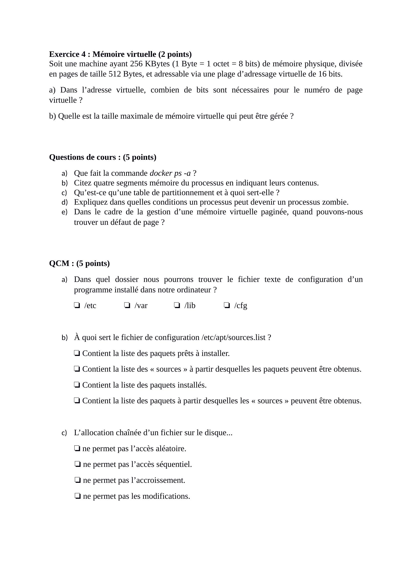 Page 3 : Exercice 4 : Mémoire virtuelle 2 pointsSoit une machine ayant 256 KBytes 1 Byte = 1 octet = 8 bits de mémoire physique, diviséeen pages de taille 512 Bytes, et adressable via une plage d’adressage virtuelle de 16 bits.a Dans l’adresse virtuelle, combien de bits sont nécessaires pour le numéro de pagevirtuelle ? b Quelle est la taille maximale de mémoire virtuelle qui peut être gérée ? Questions de cours : 5 pointsa Que fait la commande docker ps -a ?b Citez quatre segments mémoire du processus en indiquant leurs contenus.cQu’est-ce qu’une table de partitionnement et à quoi sert-elle ?d Expliquez dans quelles conditions un processus peut devenir un processus zombie.e Dans le cadre de la gestion d’une mémoire virtuelle paginée, quand pouvons-noustrouver un défaut de page ?QCM : 5 pointsa Dans quel dossier nous pourrons trouver le fichier texte de configuration d’unprogramme installé dans notre ordinateur ?❏ /etc❏ /var❏ /lib❏ /cfgb À quoi sert le fichier de configuration /etc/apt/sources.list ?❏ Contient la liste des paquets prêts à installer.❏ Contient la liste des « sources » à partir desquelles les paquets peuvent être obtenus.❏ Contient la liste des paquets installés.❏ Contient la liste des paquets à partir desquelles les « sources » peuvent être obtenus.cL’allocation chaînée d’un fichier sur le disque... ne permet pas l’accès aléatoire.❏ ne permet pas l’accès séquentiel.❏ ne permet pas l’accroissement.❏ ne permet pas les modifications.❏