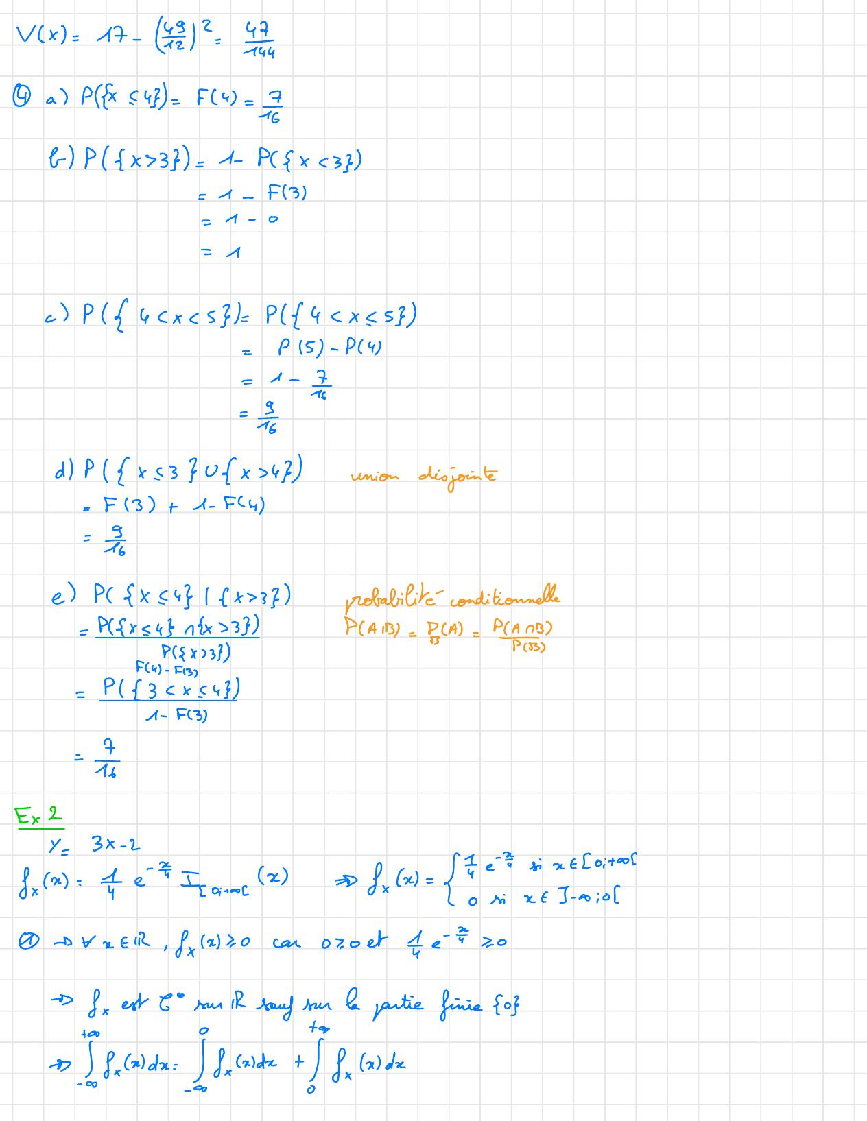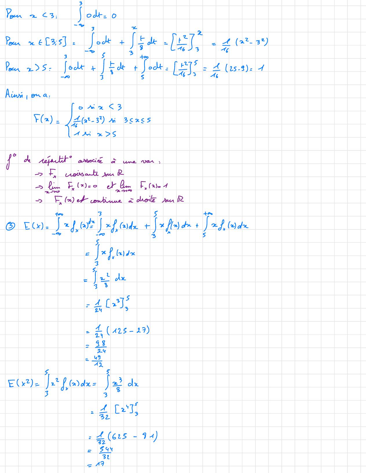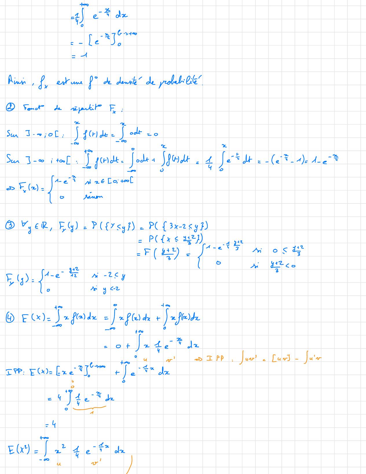 Page 1 : Ex 1Pourqu'une fo soitune fo de densite de probabilite, ilfantque:· fx0Fr EIR· Ixcontinueun IR saufpourune partie fine· fx da = 1① afu= = Fx ,sx SOnsuppose fe falpf du= 1Es & par decomposit a dreSE 1ndx = =!"Es 22= 16Es25 - 22=16Es 22=Sat - 3; 33· suposonsquex=-3 :dansacas80canfl-3 0 =f n'est pasune fo de densitede proba·suposonsquex=3:- fxsur R- fest E su iR\3 ; 53-fluid= 1 proce+ hautAnisi, festunefdpssi -b-!3m②X est une variablealiatoire velleabsolument convergenteda fo de dinsitede probafa Fatir, Fm= frdtx3fx=s
